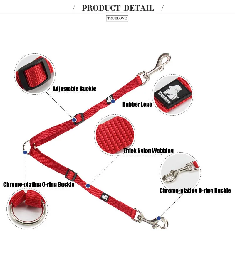 Наименование товара: нейлоновый двойной поводок для собак TrueloveМуфта для двух собакМатериал: нейлон, крюк из нержавеющей стали и уплотнительное кольцоЦвет: черный, красный, розовый
