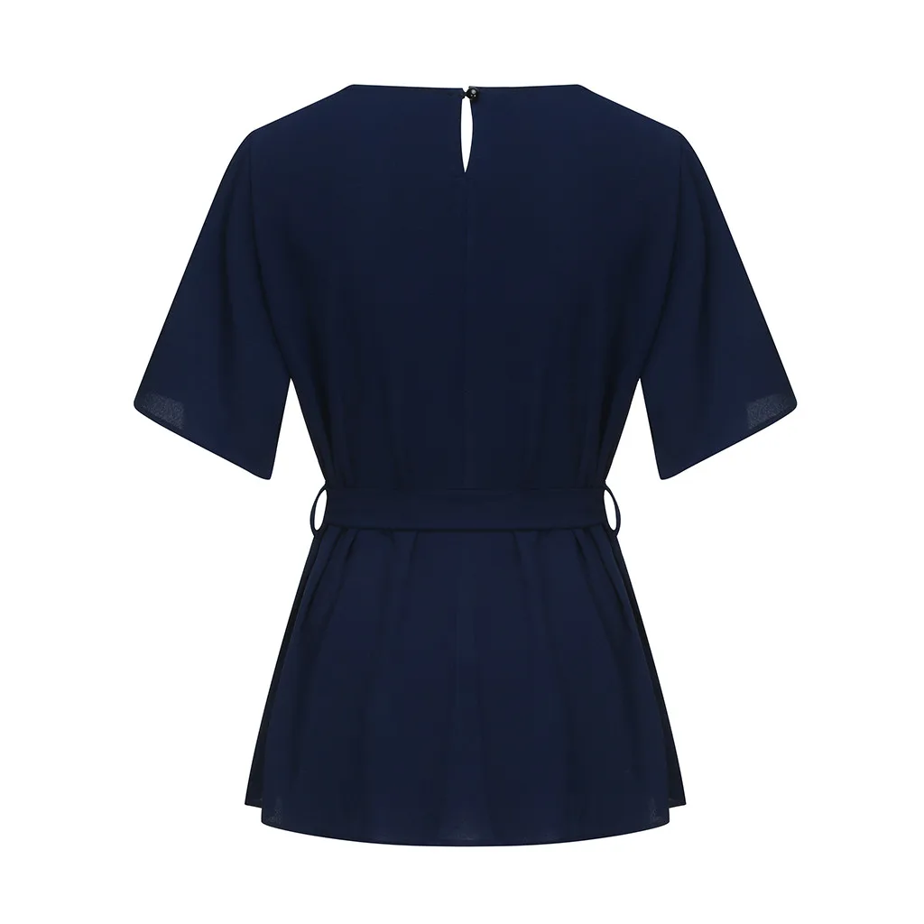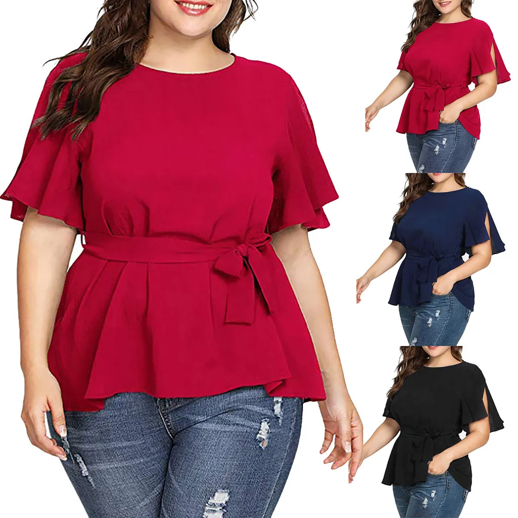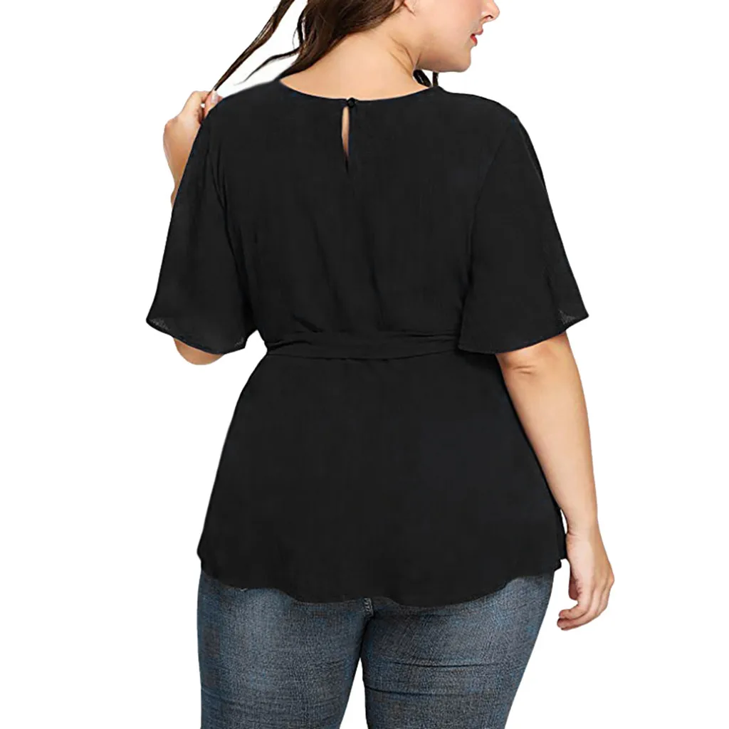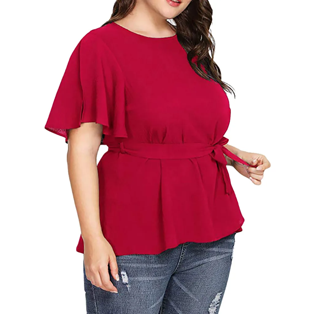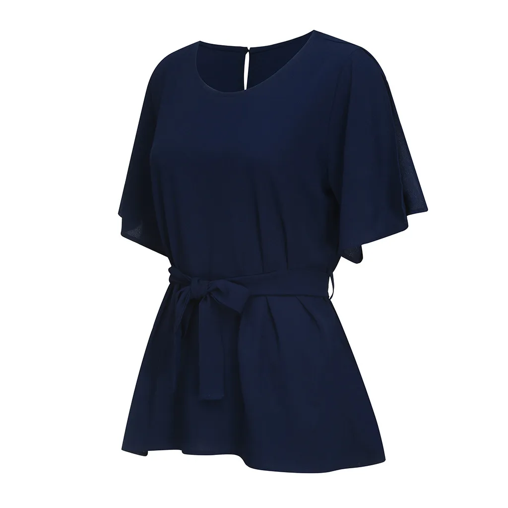 Женская блузка с поясом, однотонная Повседневная Свободная рубашка с коротким рукавом, топы, Женские топы и блузки, размера плюс