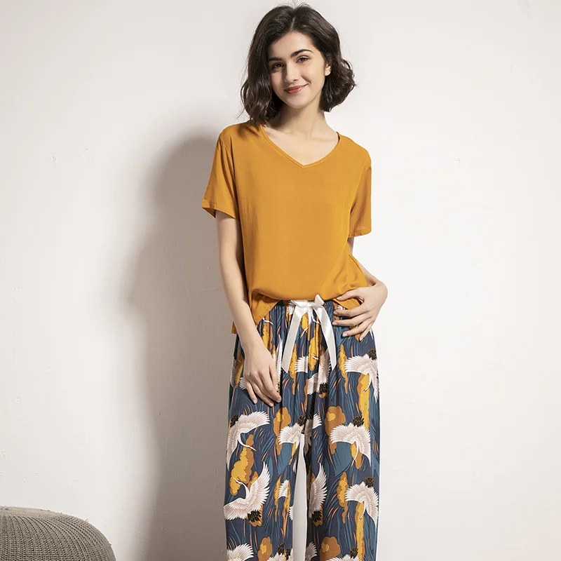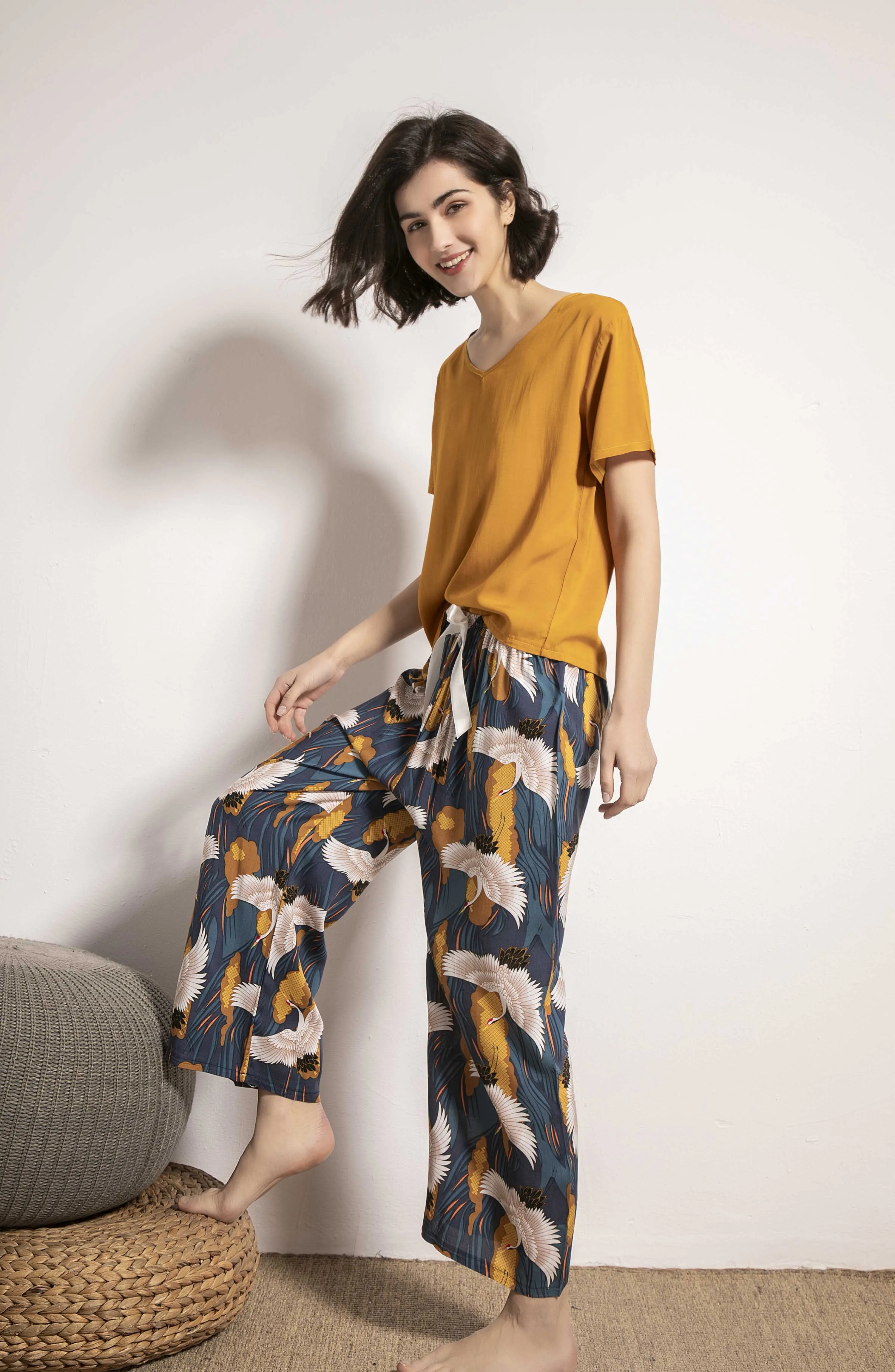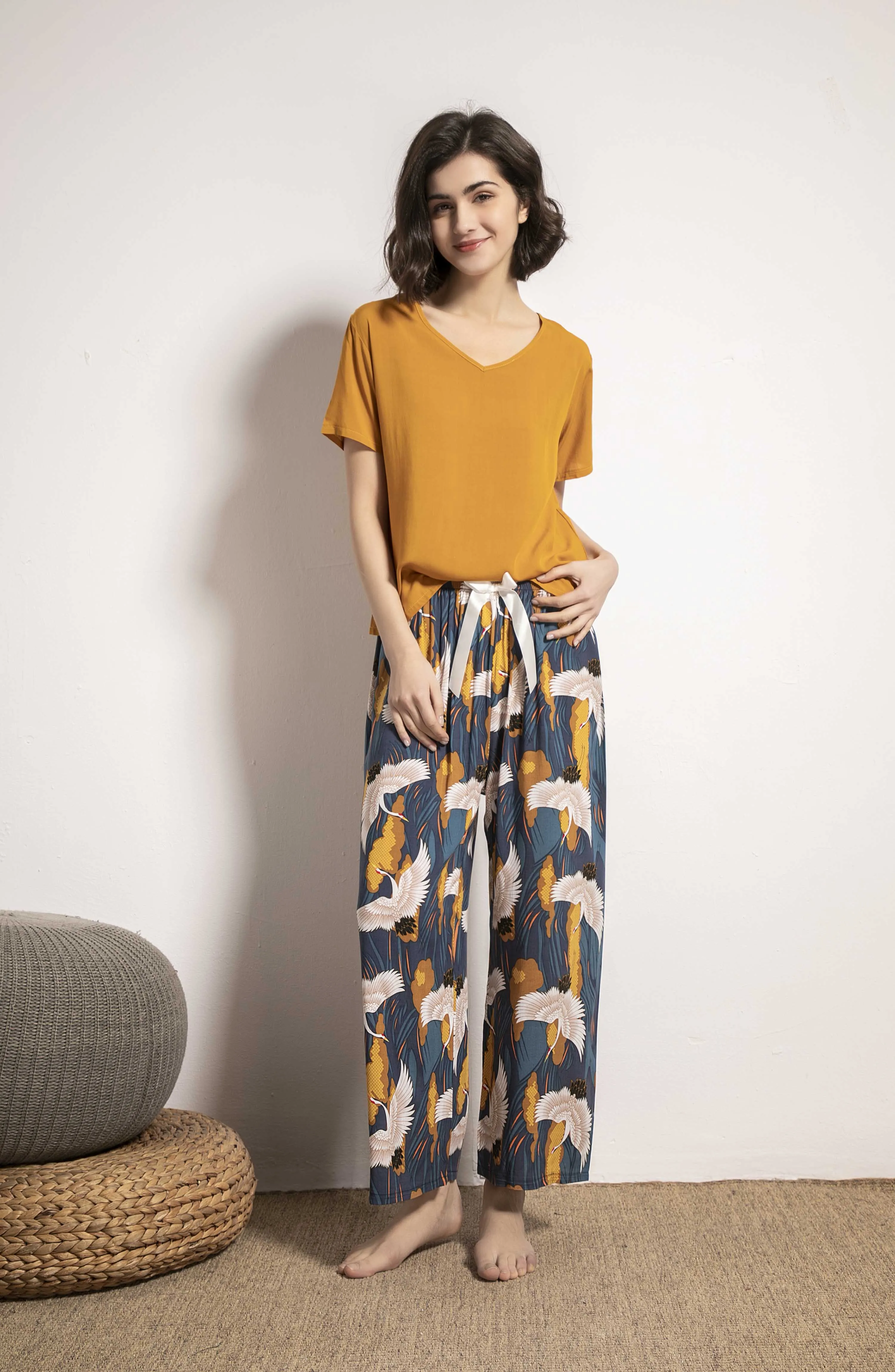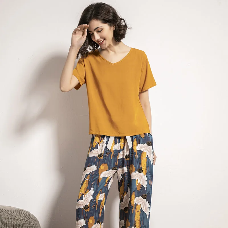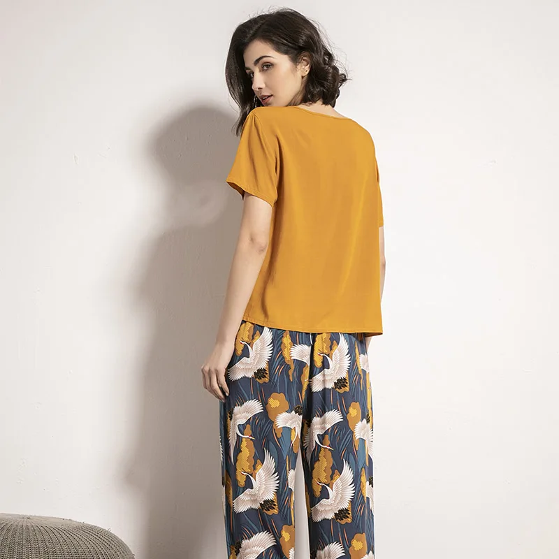 Женский пижамный комплект из 2 предметов, мягкий Свободный Топ с коротким рукавом и штаны с принтом журавлей из мультфильмов, Повседневная Домашняя одежда, весна-лето 2022