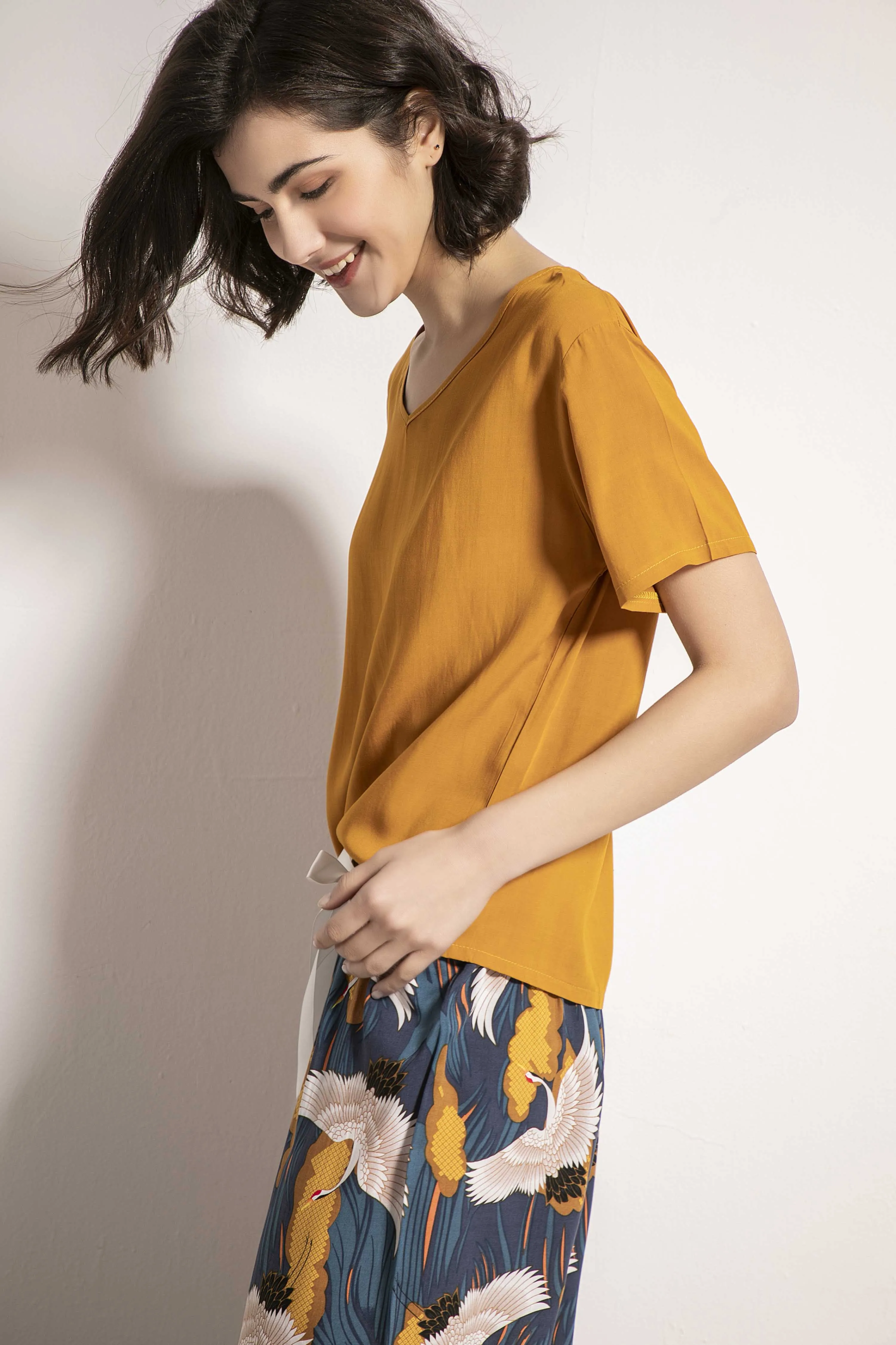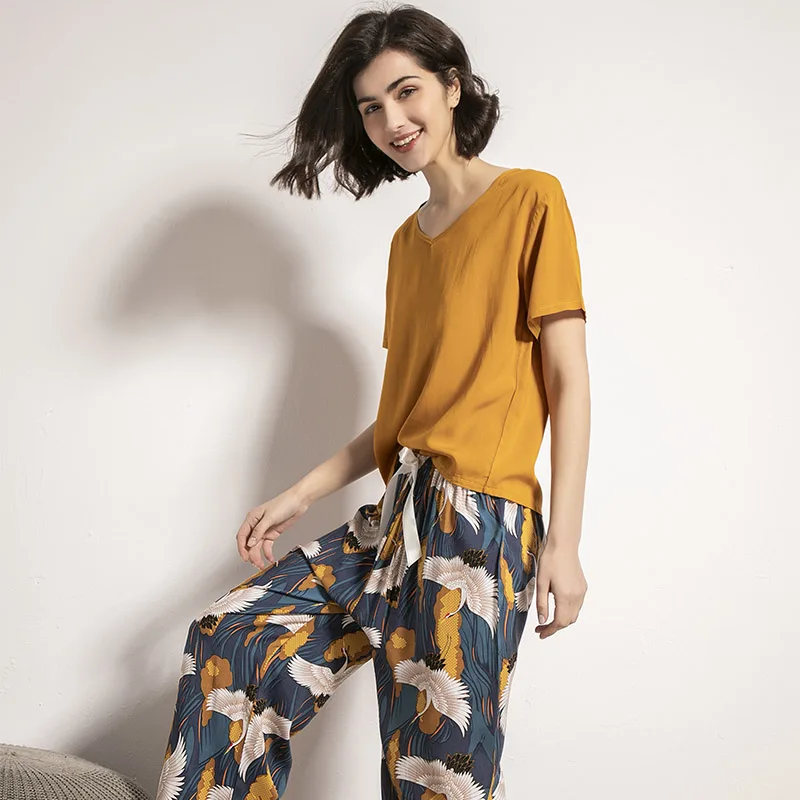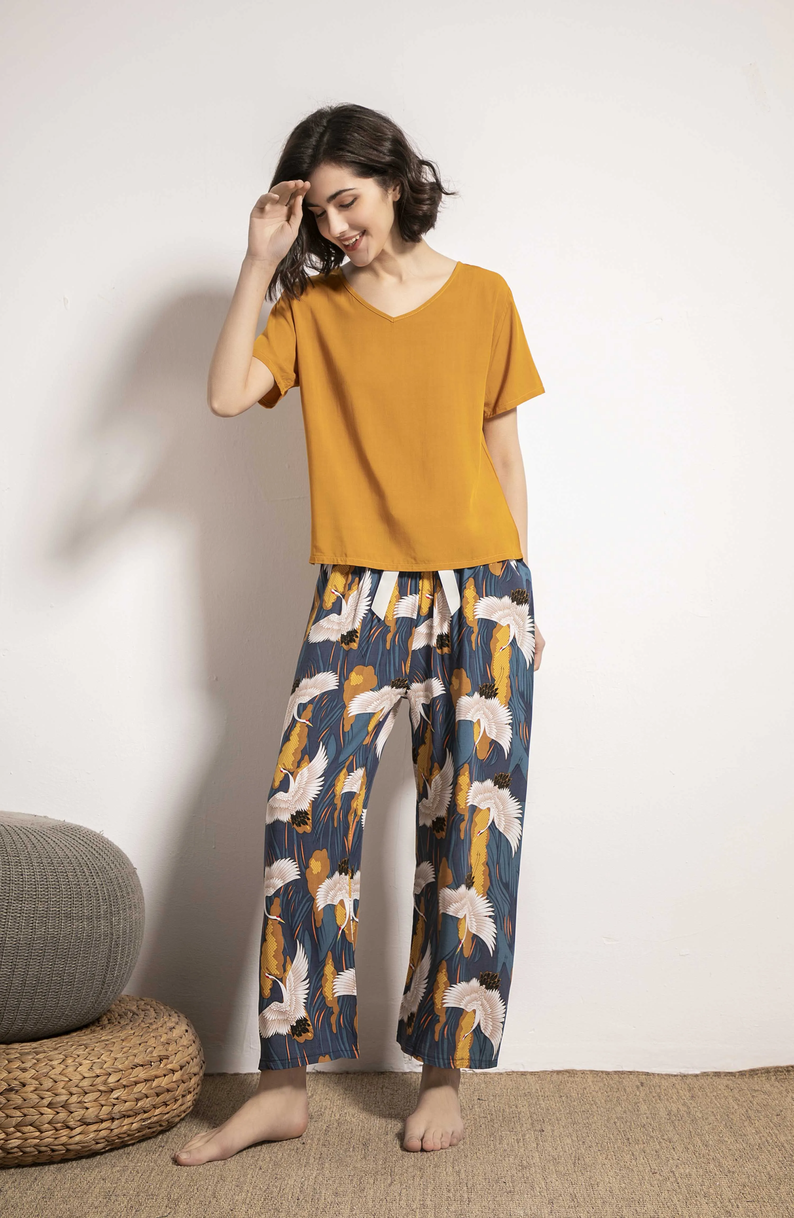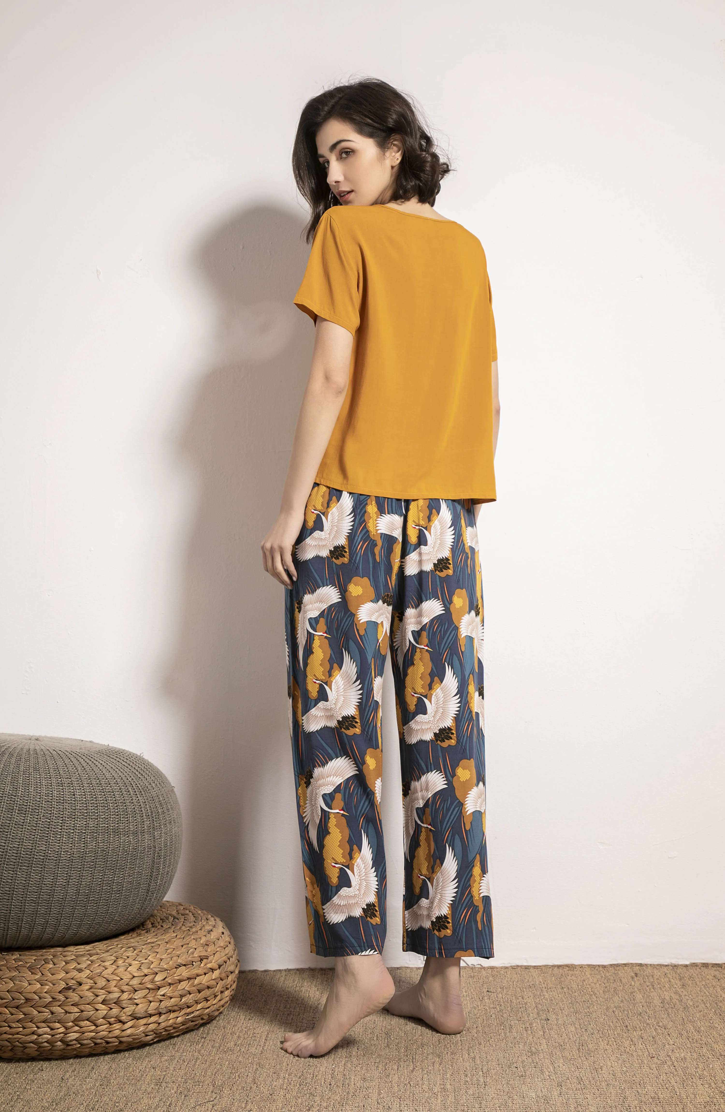 Женский пижамный комплект из 2 предметов, мягкий Свободный Топ с коротким рукавом и штаны с принтом журавлей из мультфильмов, Повседневная Домашняя одежда, весна-лето 2022