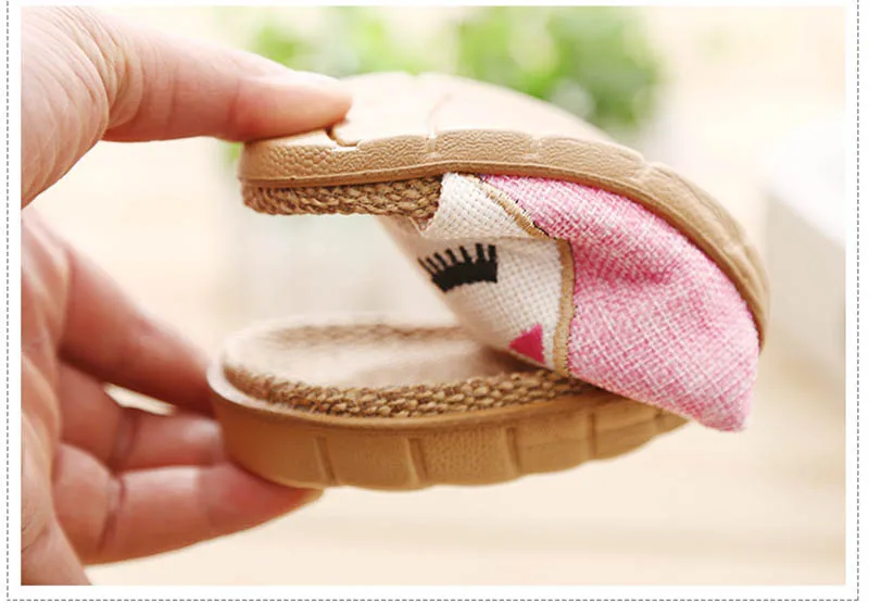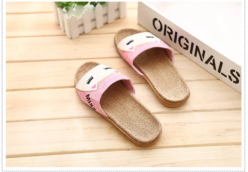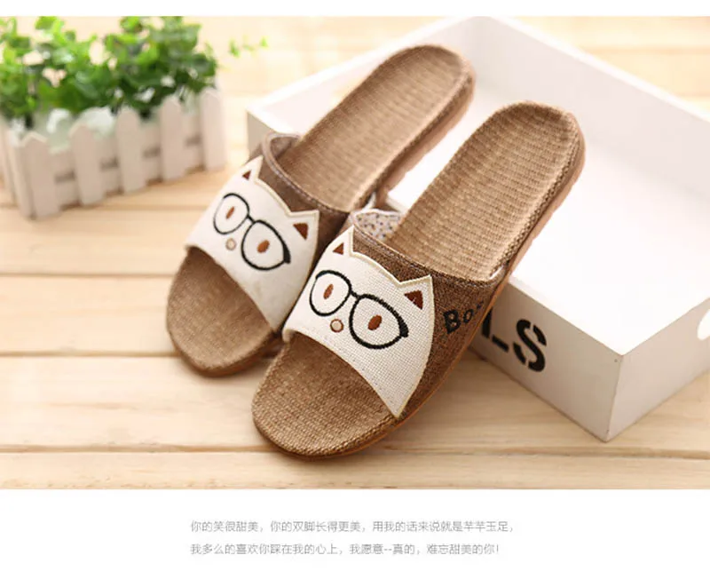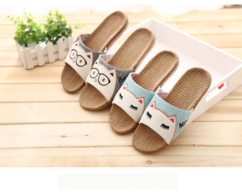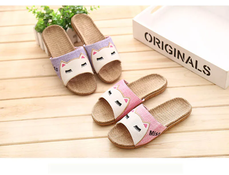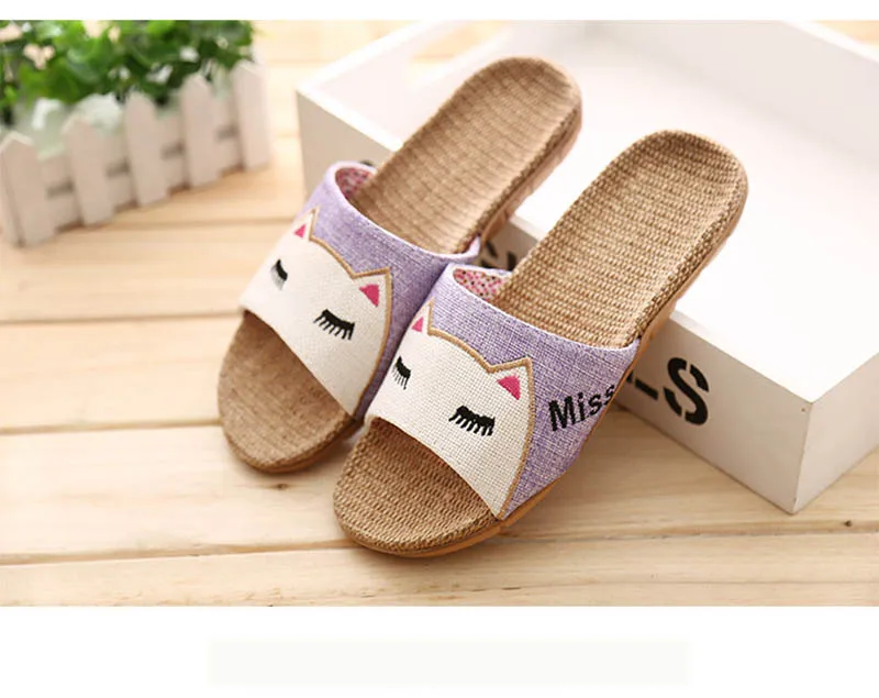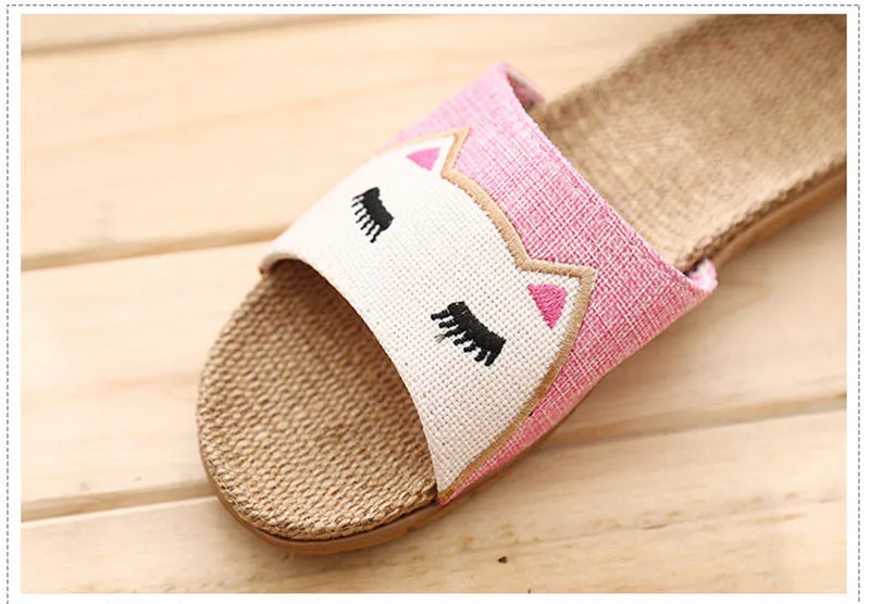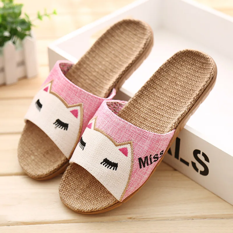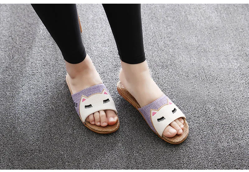 Шлепанцы женские льняные в богемном стиле, повседневные сандалии с мультяшным котом, Нескользящие, плоская подошва, пляжная обувь
