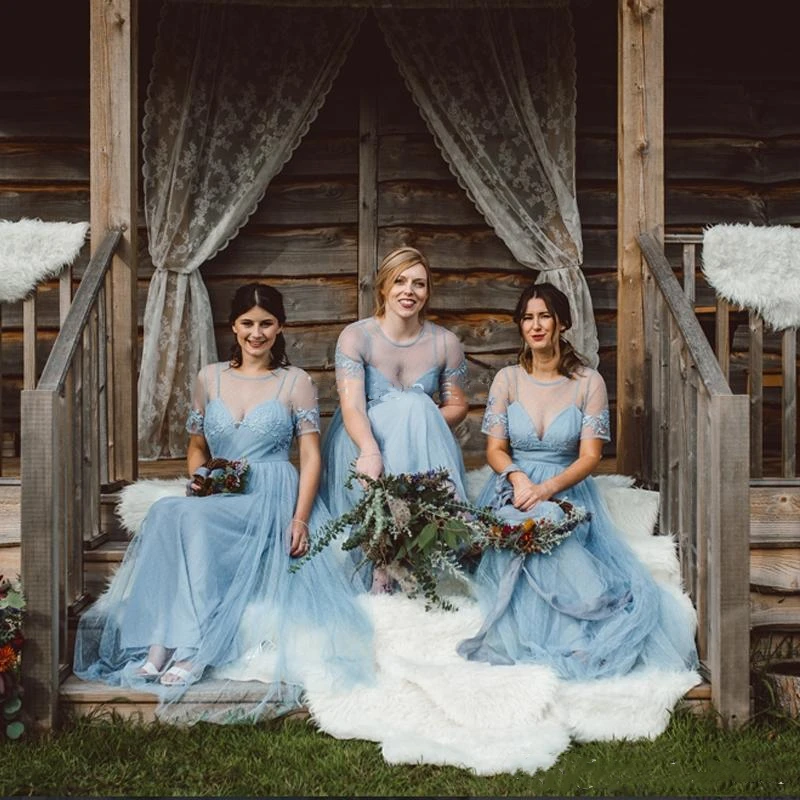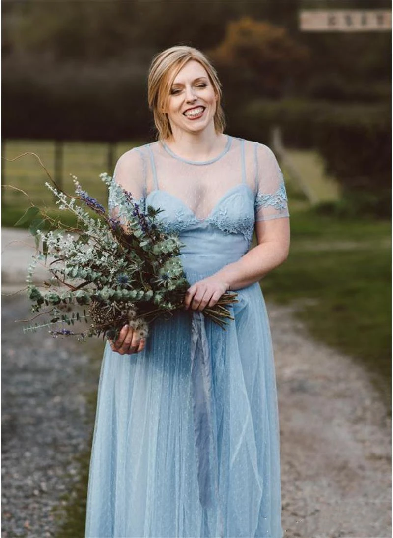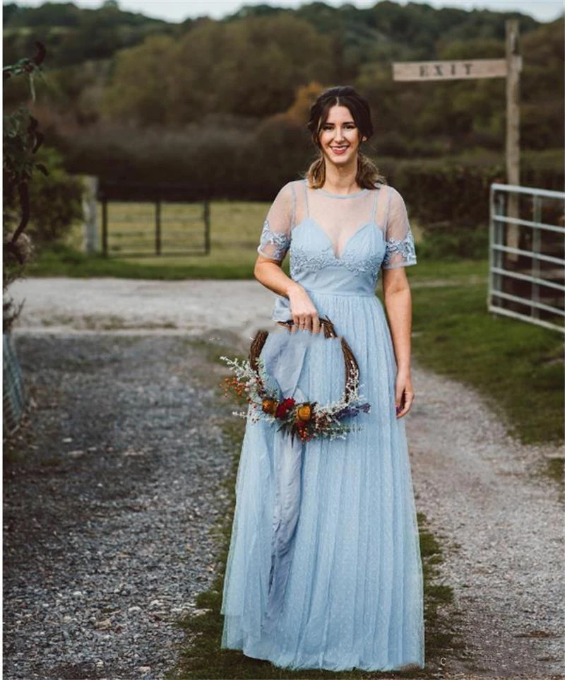 Светлые голубые блестящие макси платья YiMinpwp до пола с коротким рукавом и круглым вырезом, кружевные аппликации для гостей деревенской свадьбы