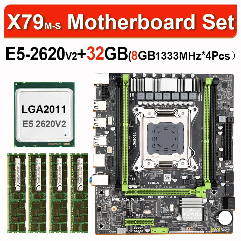 Комплект из материнской платы X79 M-S, процессор Xeon E5 2620 V2 4x8 ГБ 32 ГБ DDR3, ОЗУ с ECC, 1333 МГц, 10600 память SATA, USB 3,0 Мбитс