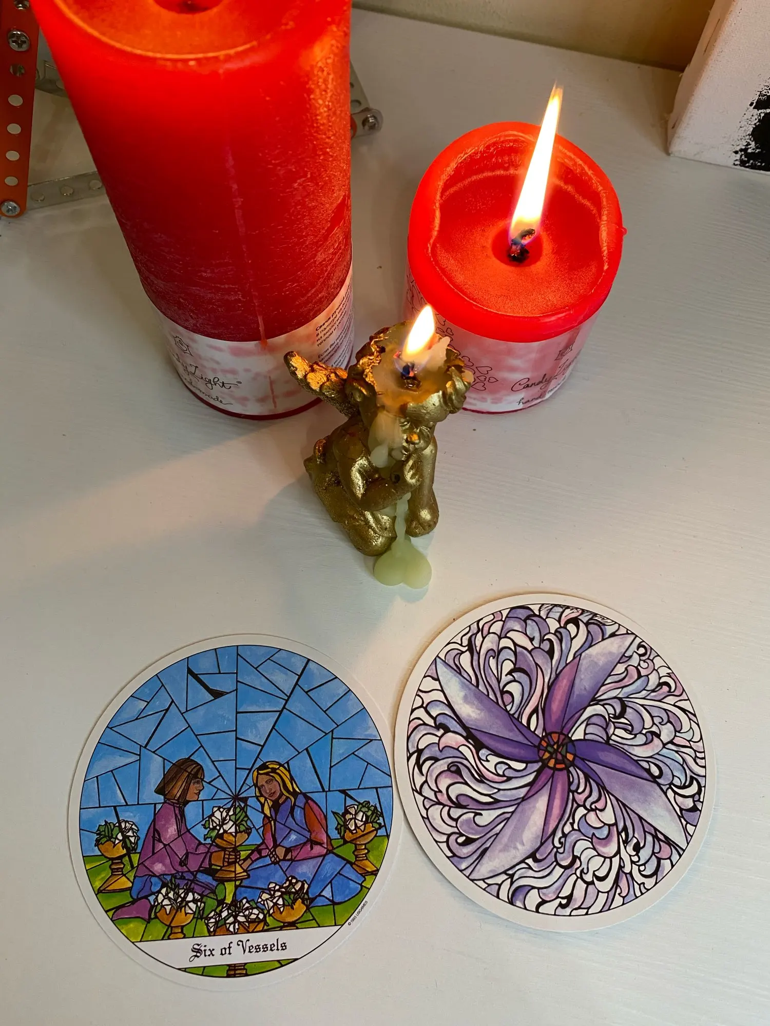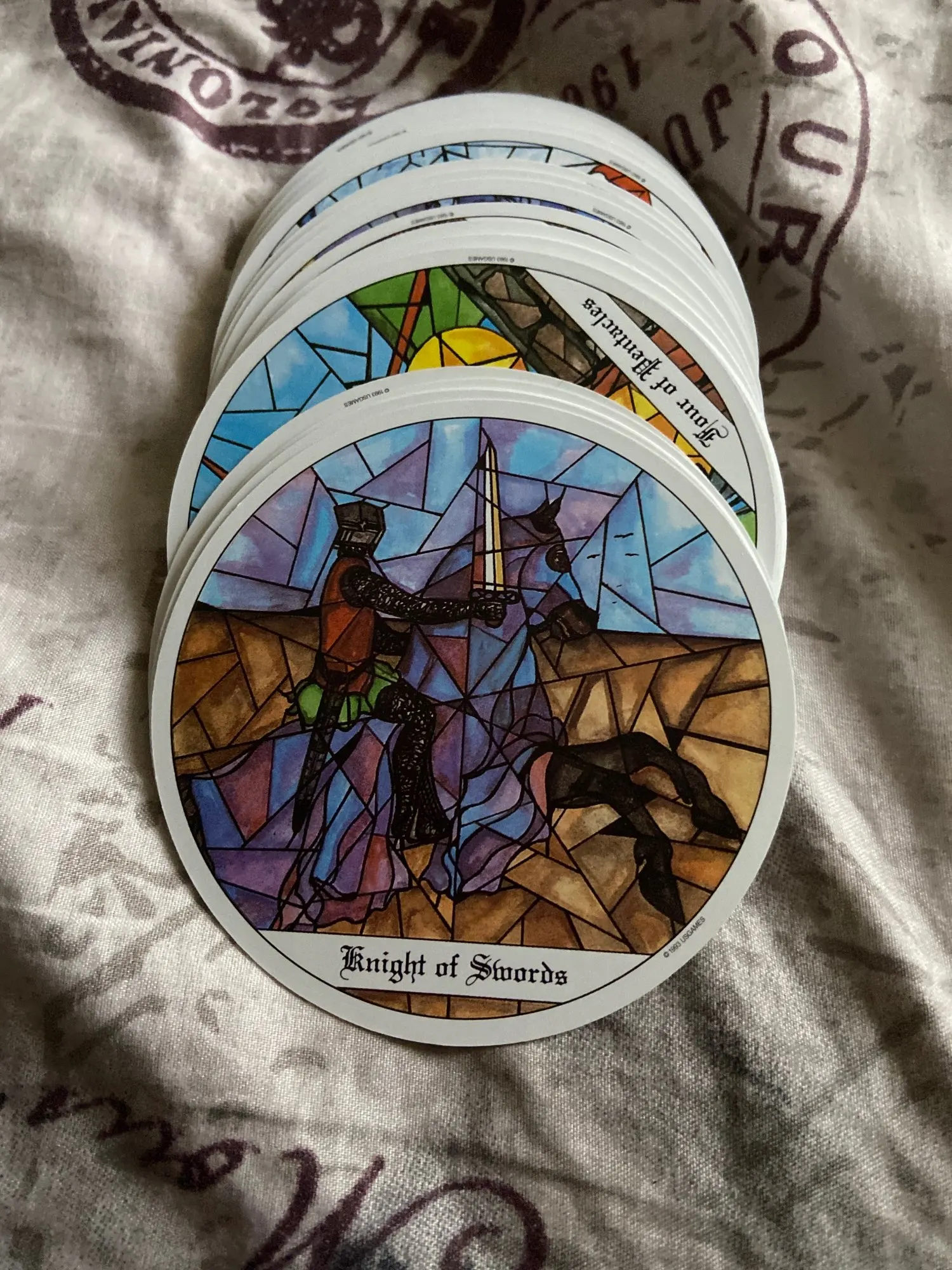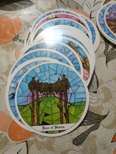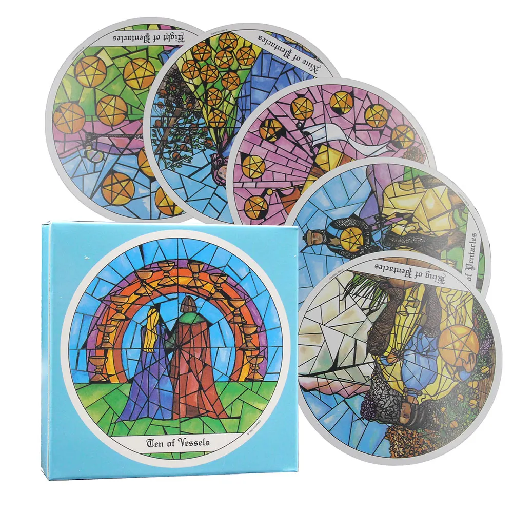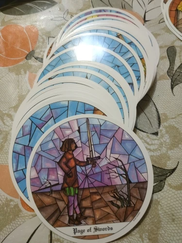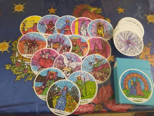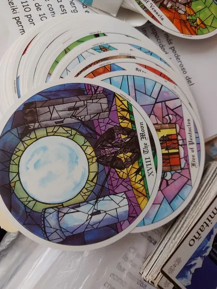 Baraja muy original, cartas circulares bien cortadas, cantos suaves, satinado ligero, colores vibrantes e imágenes definidas. Se inspiran mucho en Rider Waite pero no son iguales. Muy intuitivas. Me gustan. Tamaño bastante manejable. Si fueran más grandes siendo circulares se caerían todo el tiempo.
