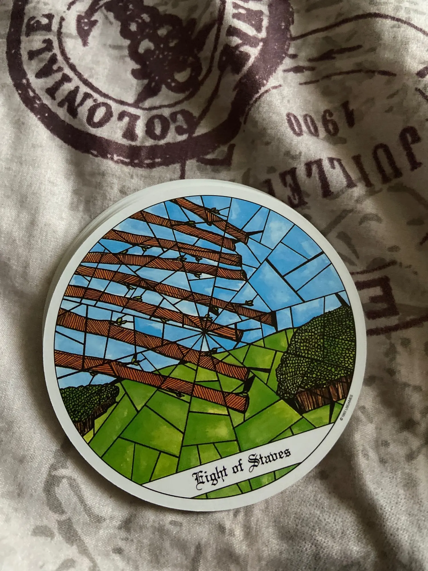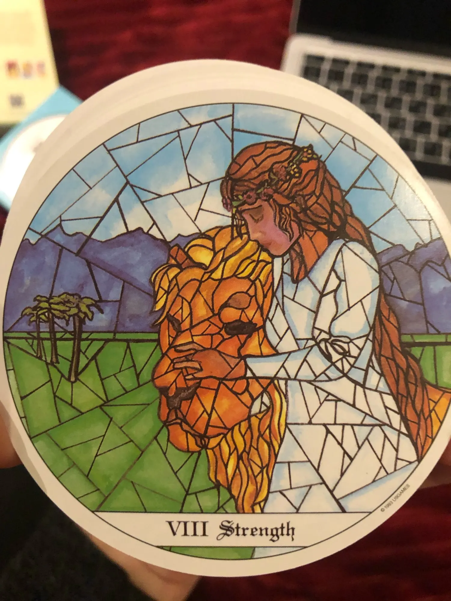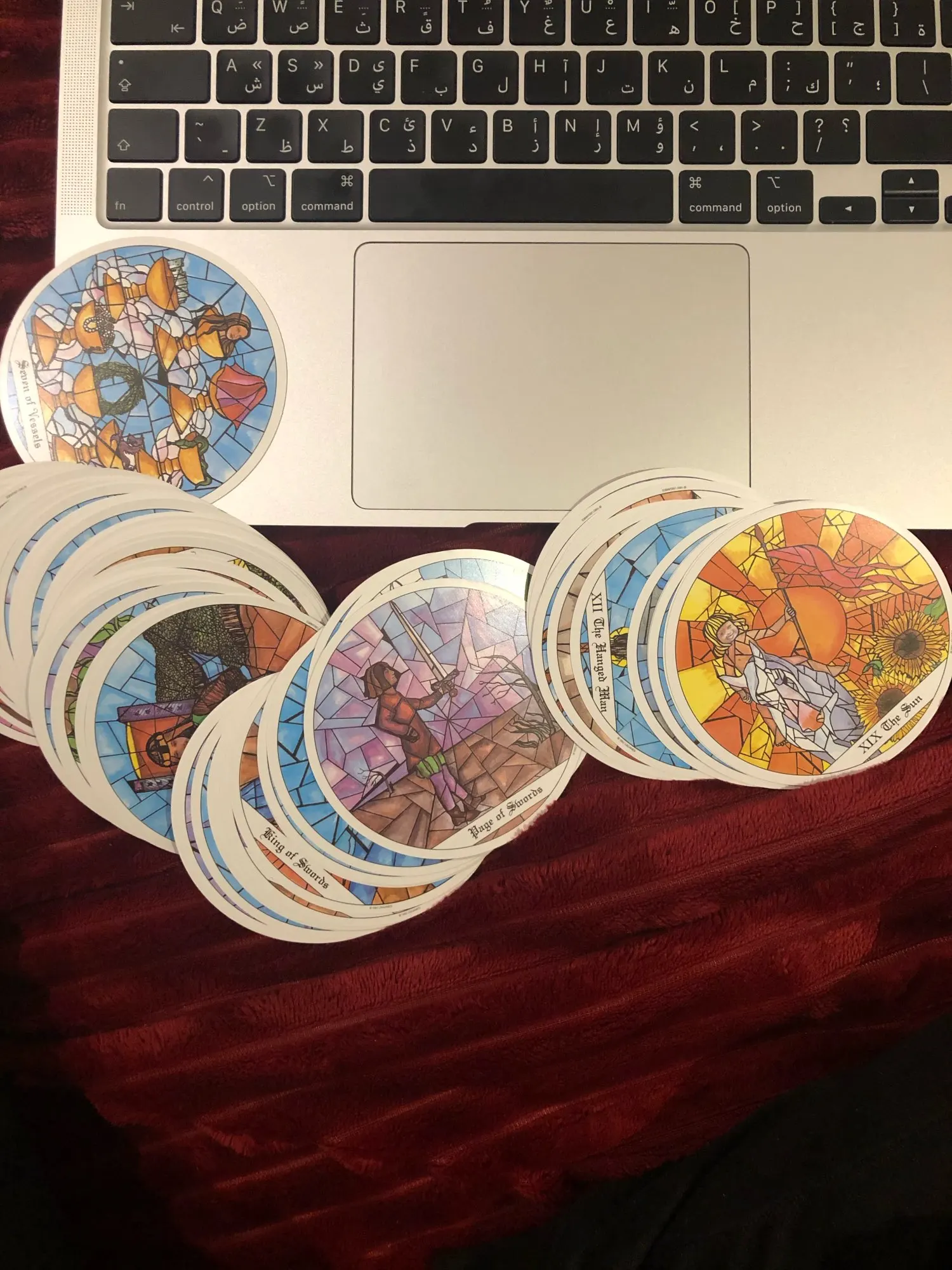 Baraja muy original, cartas circulares bien cortadas, cantos suaves, satinado ligero, colores vibrantes e imágenes definidas. Se inspiran mucho en Rider Waite pero no son iguales. Muy intuitivas. Me gustan. Tamaño bastante manejable. Si fueran más grandes siendo circulares se caerían todo el tiempo.