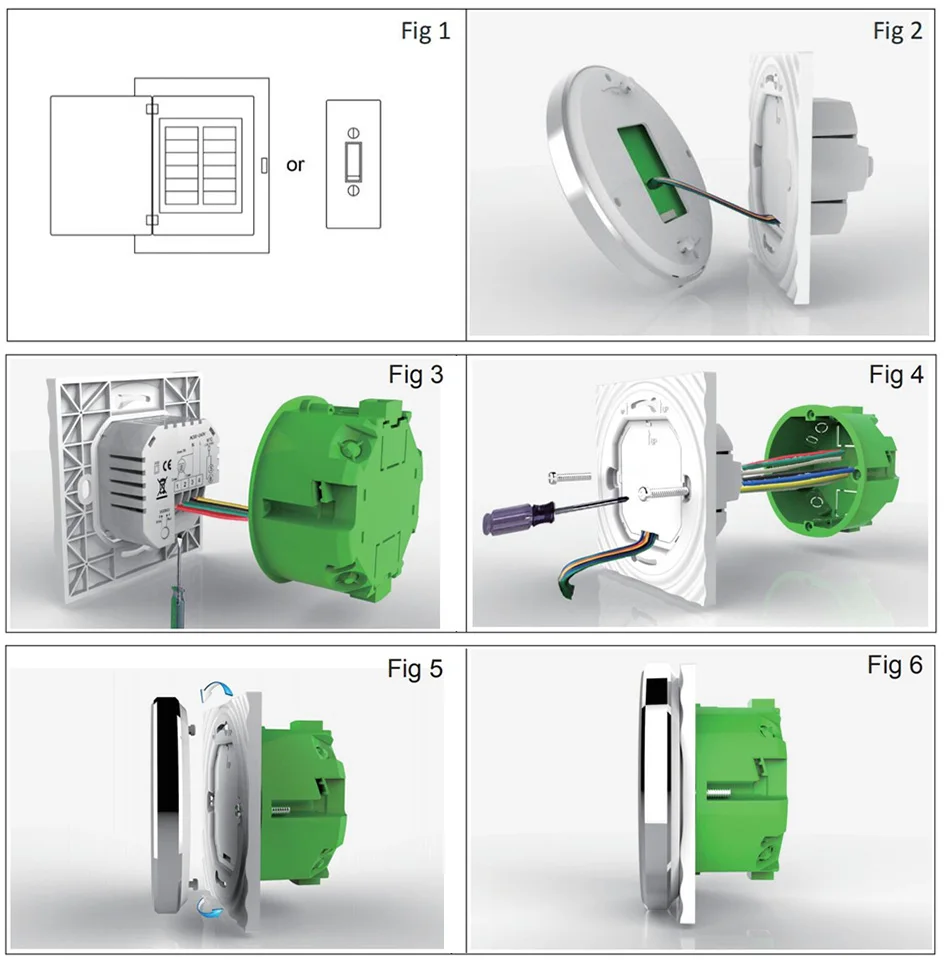 Ваш термостат подходит для установки в стандартную паттернскую коробку 86 мм или европейскую паттернскую коробку 60 мм Шаг 1. Поддерживайте питание. См. Рис. 1 Шаг 2. Снимите монтажную пластину, поворачивая ЖК-часть. См. Рис. 2. Шаг 3. Подключите источник питания, вставьте в соответствующие клеммы (подробности см. На рис. 3). Шаг 4. Закрепите монтажную пластину в стене с помощью винтов в коробке. См. Рис. 4. Шаг 5. Закрепите корпус термоата и монтажную пластину через вращение. См. Рис. 5. Шаг 6. Установка завершена. См. Рис. 6.