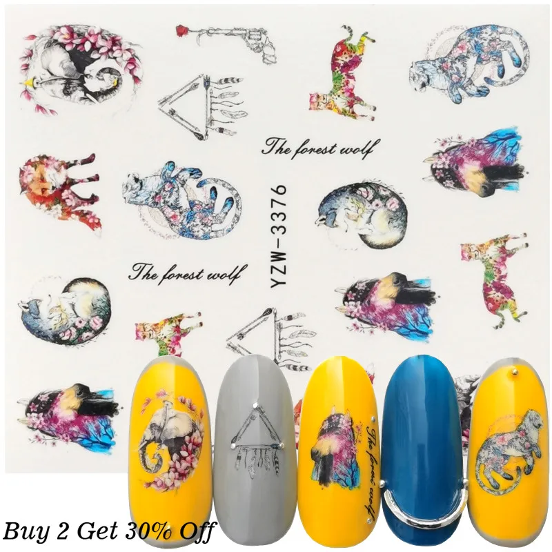 Волчий стикер для дизайна ногтей, водная наклейка, слайдер, цветок,...