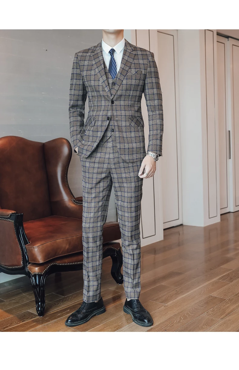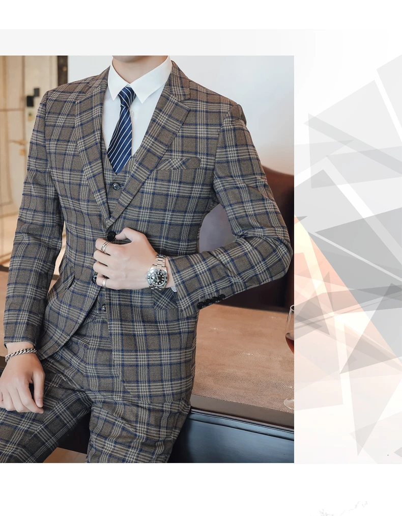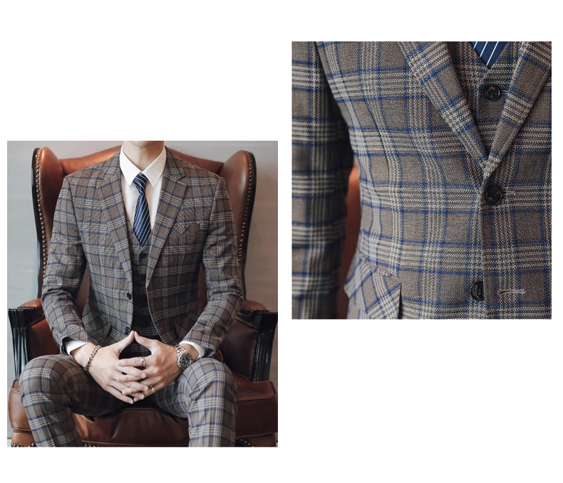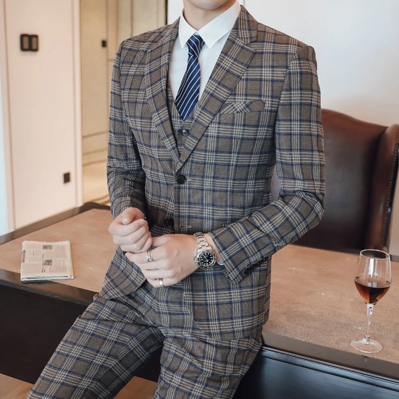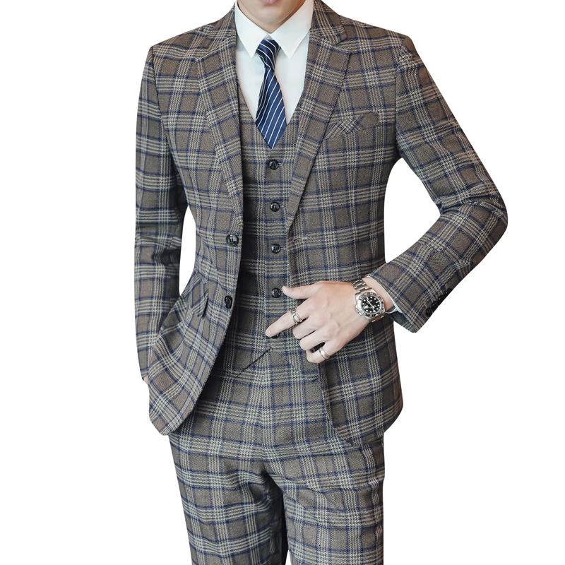 Костюм мужской однобортный, мужские клетчатые костюмы, мужской комплект из 3 предметов, деловой костюм для мужчин, британский официальный костюм Terno, мужской свадьба