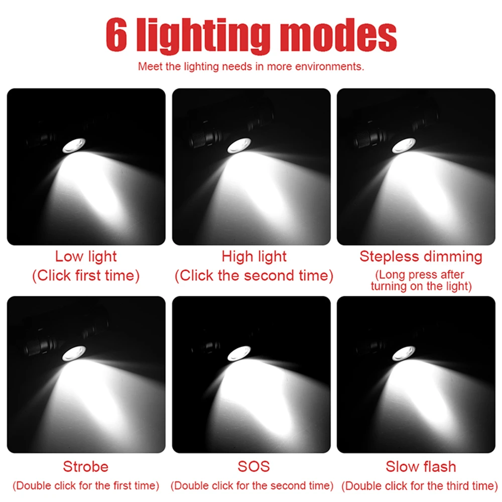 Нажмите обычный переключатель для включения или выключения1. Один щелчок для настройки одного режима. Циклы от низкого -- высокого2. Нажмите 3 секунды, чтобы включить плавное затемнение3. Нажмите дважды быстро, чтобы включить и отрегулировать стробоскоп-SOS-медленная вспышка4. Используйте usb-кабель для подзарядки фары.5. При зарядке светильник красного цвета, это означает зарядку, светильник зеленого цвета, это означает полную зарядку.