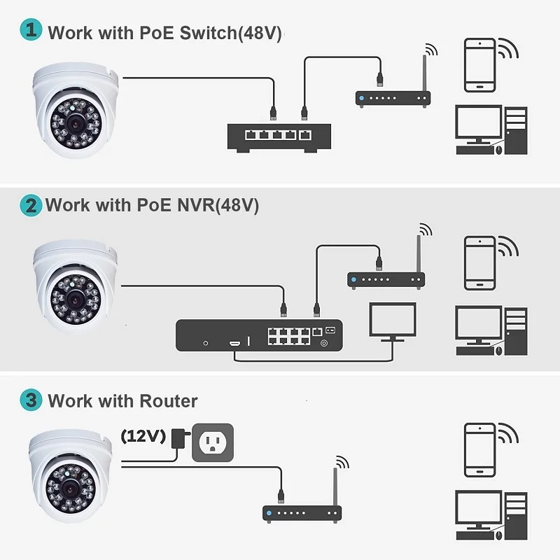 1. IP-камера H.265 + 2,8 мм купол объектива. 2 посылка не входит адаптер питания (можно купить блок питания самостоятельно) 3. Источник питания IP-камеры по умолчанию-12 В; Блок питания POE 48 В должен быть сопряжен с переключателем POE 48 В.