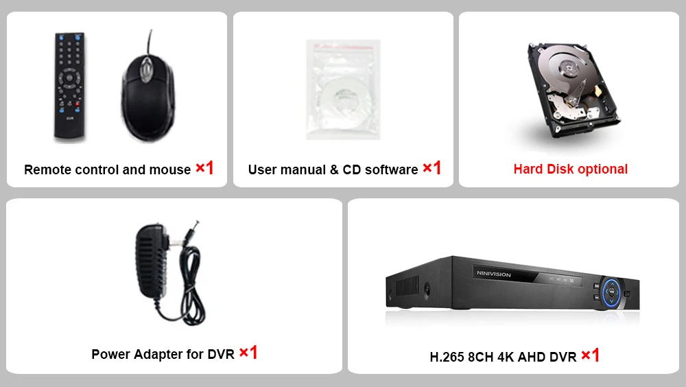1 х H.265 8CH 4K 6 в 1 AHD DVR гибридный цифровой видеорегистратор;1 x Блок питания для DVR;1 X USB мышь для DVR;1 компакт-диск программного обеспечения для DVR;1 пульт дистанционного управления для DVR;Жесткий диск опционально!