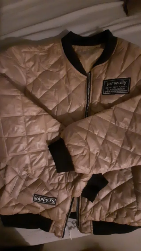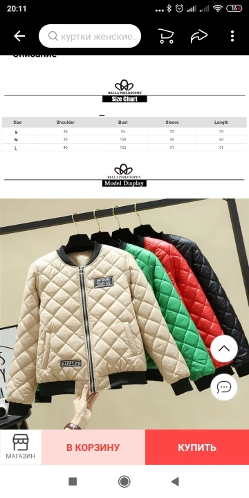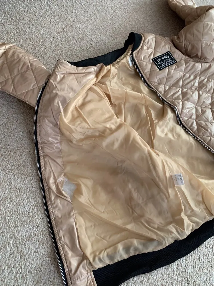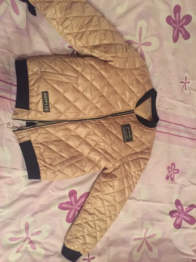 очень понравилась курточка. размер L подошёл идеально на ог 100 см, больше не надо. на мой рост 157 см рукава отлично и длина тоже. на не холодную осень и весну. сшита качественно, наполнитель равномерный. цвет скорее золотистый. доставка в Канаду долгая полтора месяца. мягкая, приятная. рекомендую.