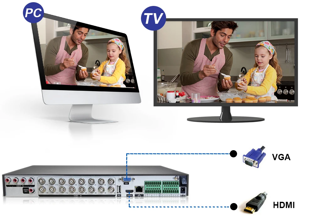 Просмотр на мониторе HDMIЛегко отображать видео через порт HDMI вашего монитора компьютера, чтобы в полной мере воспользоваться ясностью системы безопасности. (Кабель HD не входит в комплект)Просмотр по телевизору или монитору ПКДля дополнительного удобства видеорегистратор также поставляется с разъемами VGA и BNC для стандартных вариантов просмотра разрешения. (кабель VGA или BNC к RCA не входит в комплект.)
