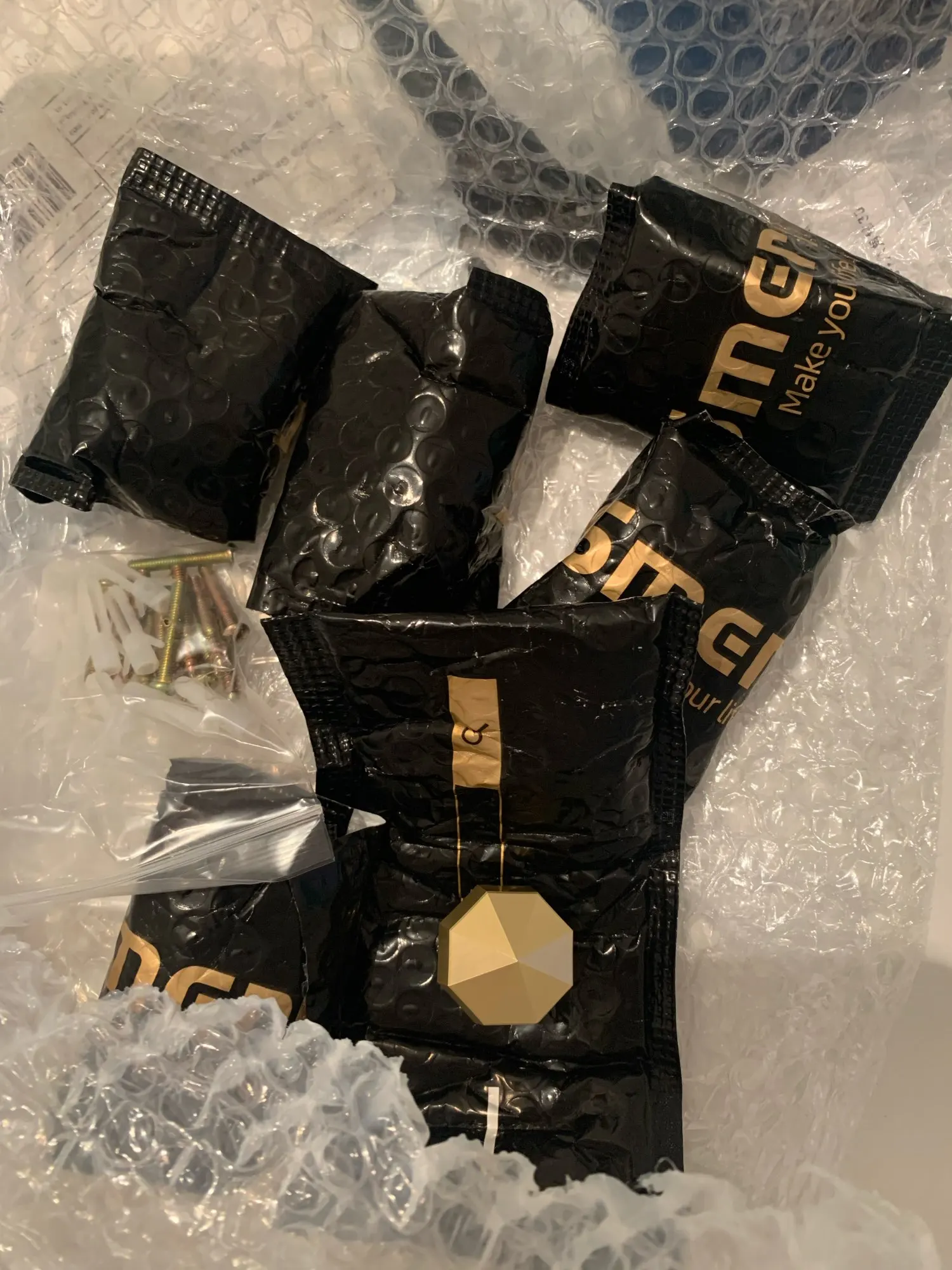 Каждая ручка приходит в своей упаковке. Тяжеленькие, в комплекте идёт как шуруп, так и дюбель (что очень удобно). Качество прекрасное!