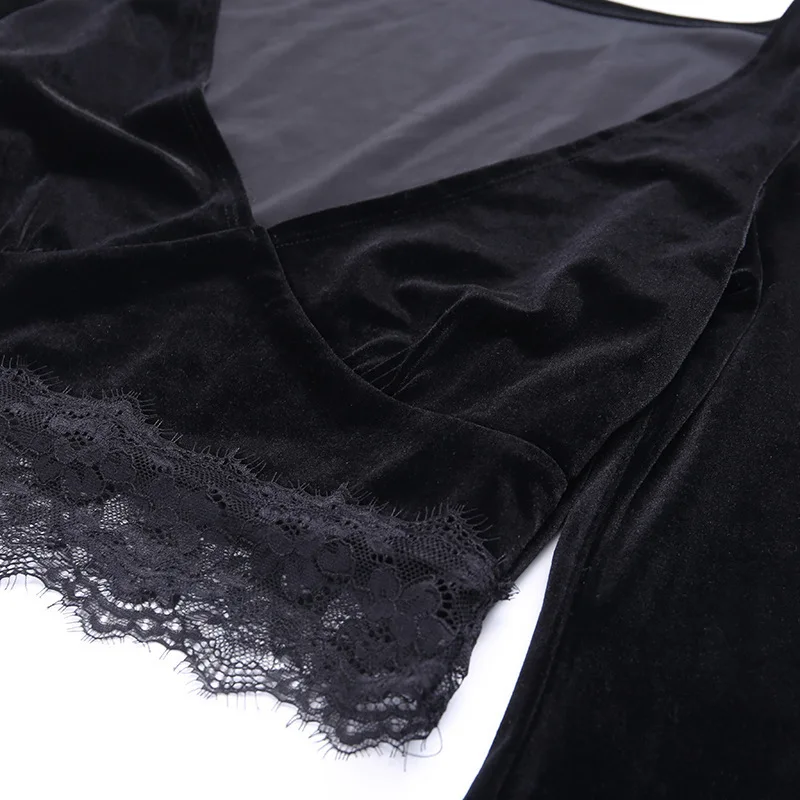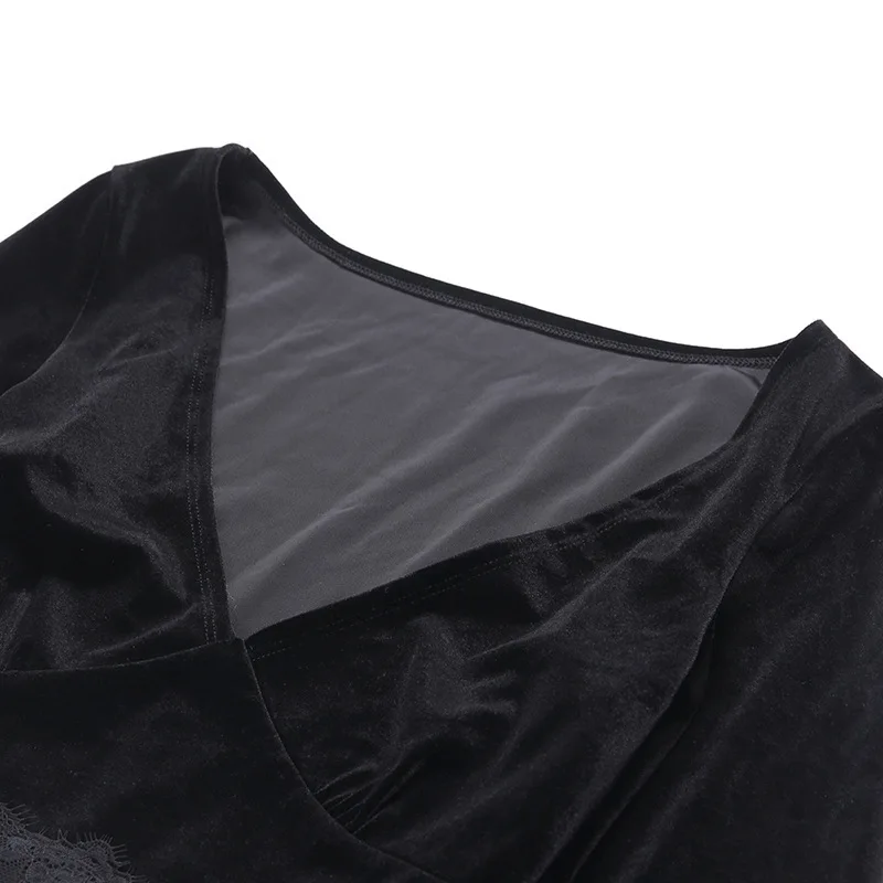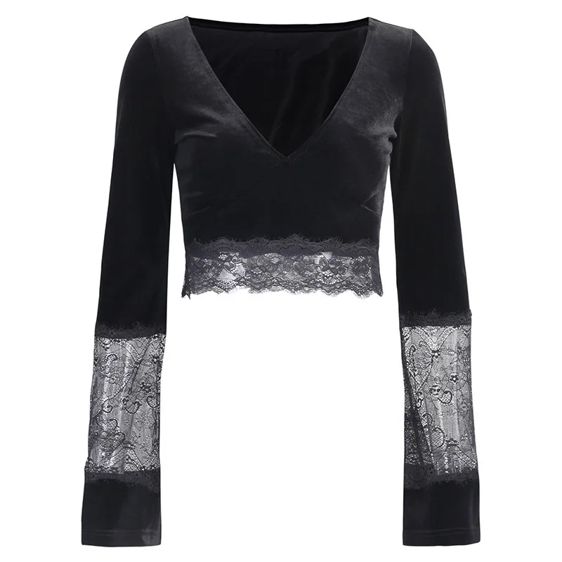Женский короткий топ JIEZuoFang, черная Готическая футболка с длинным рукавом и V-образным вырезом, элегантный топ