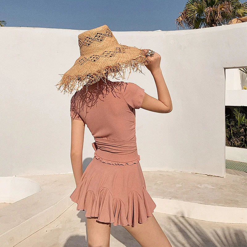 Бикини с юбкой, Женский однотонный купальник, бикини с коротким рукавом, купальник с пуш-ап, бикини с высокой талией, купальный костюм с оборками, пляжный купальник