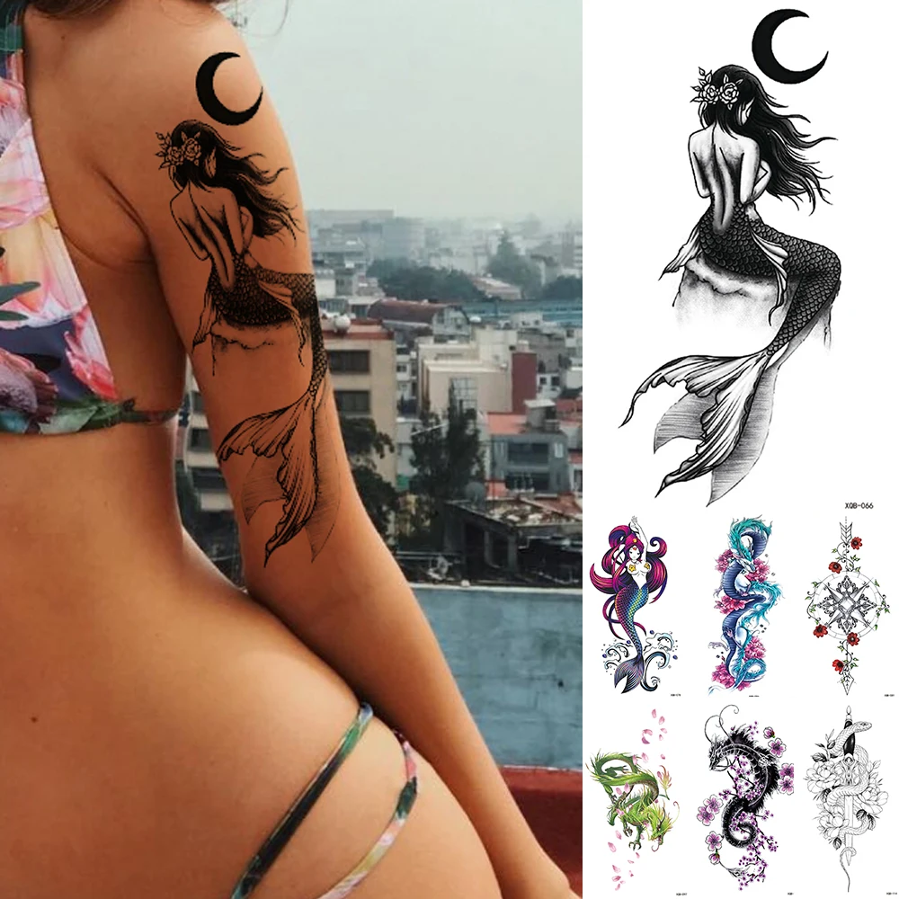 Татуировка переводная Временная водостойкая для мужчин и женщин, тату-наклейка с Луной, морем, русалочкой, флэш-тату, цветами, черепом, драконом, боди-арт