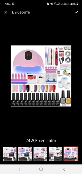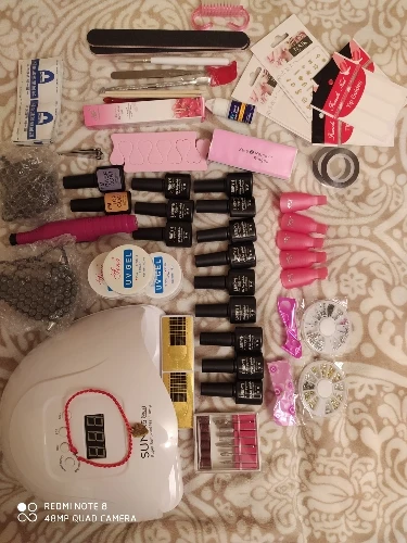 Самый классный набор!!! Очень понравился, Заказывала с доставкой из России, в Ульяновск и пришёл менее, чем за10 дней. Все в порядке, только розовый и прозрачный гели для наращивания немного гуще обычного, белый нормальный. Классная палитра цветов. Лампа работает, пилка электрическая тоже! Это меня очень порадовало Топ и база в норме. Только серебряный гель лак густой с комками, не особо расстроилась, потому что чего только нет тут Очень классный набор, цена для него очень приемлемая, если брать все по отдельности в России, то выйдет в несколько раз дороже! Рекомендую, мне он очень понравился