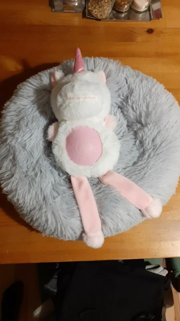 Es tal cual se describe . Contenta tardó poco en llegar. Es mullido . El paquete llego un poco roto pero por dentro estaba bien