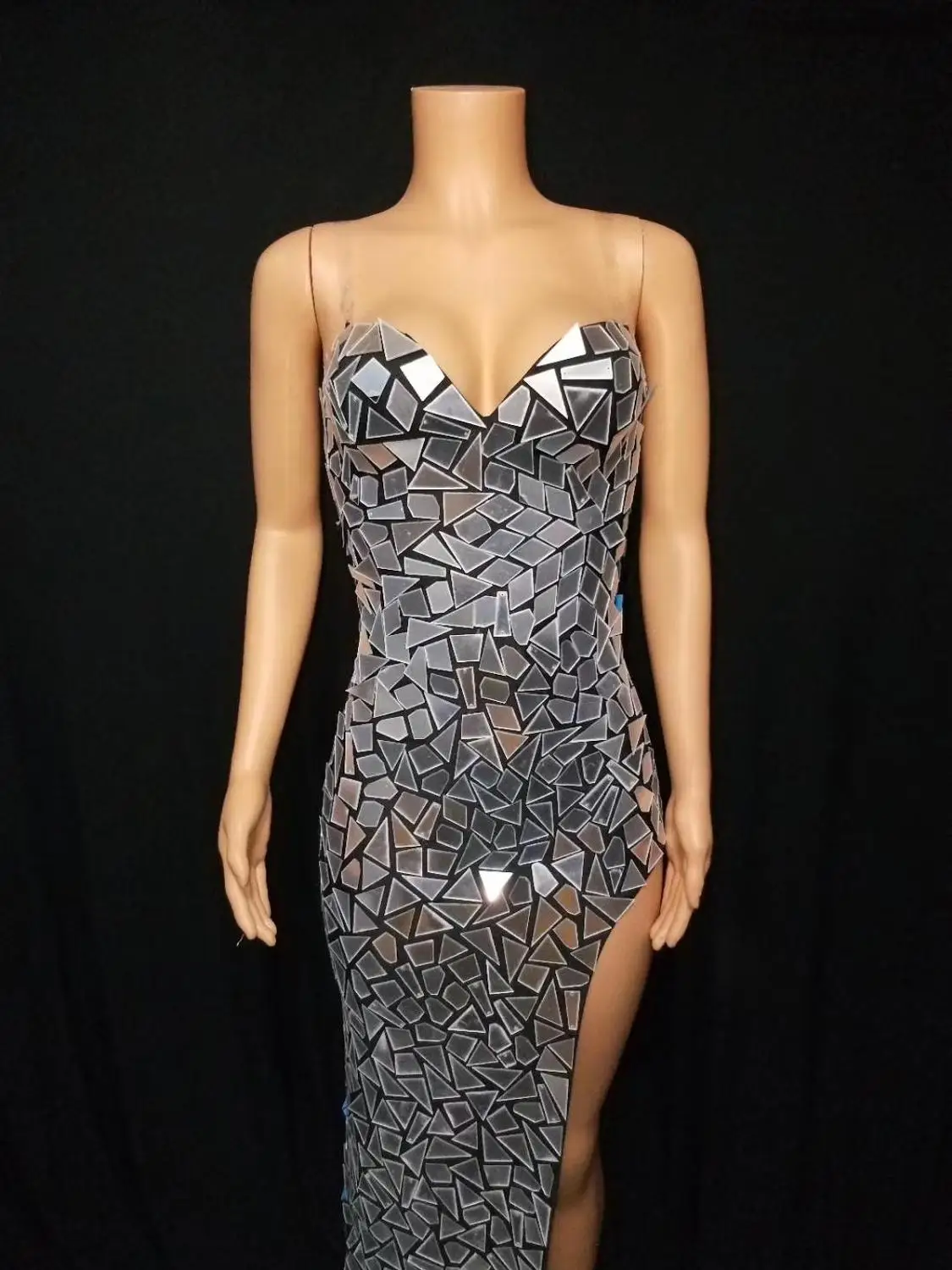 Новинка 2020, женское блестящее длинное серебристое платье с зеркальным хвостом, вечернее платье для празднования дня рождения, блестящие платья для бара и певицы