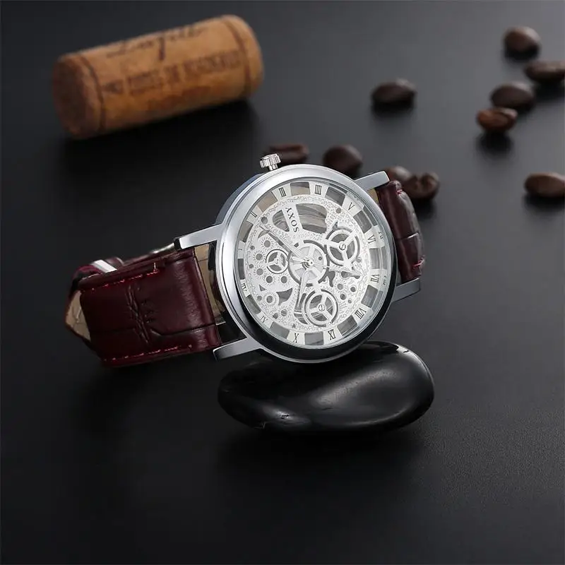 Бизнес Мужские часы Роскошные полые мужские часы кожаные мужские ча...