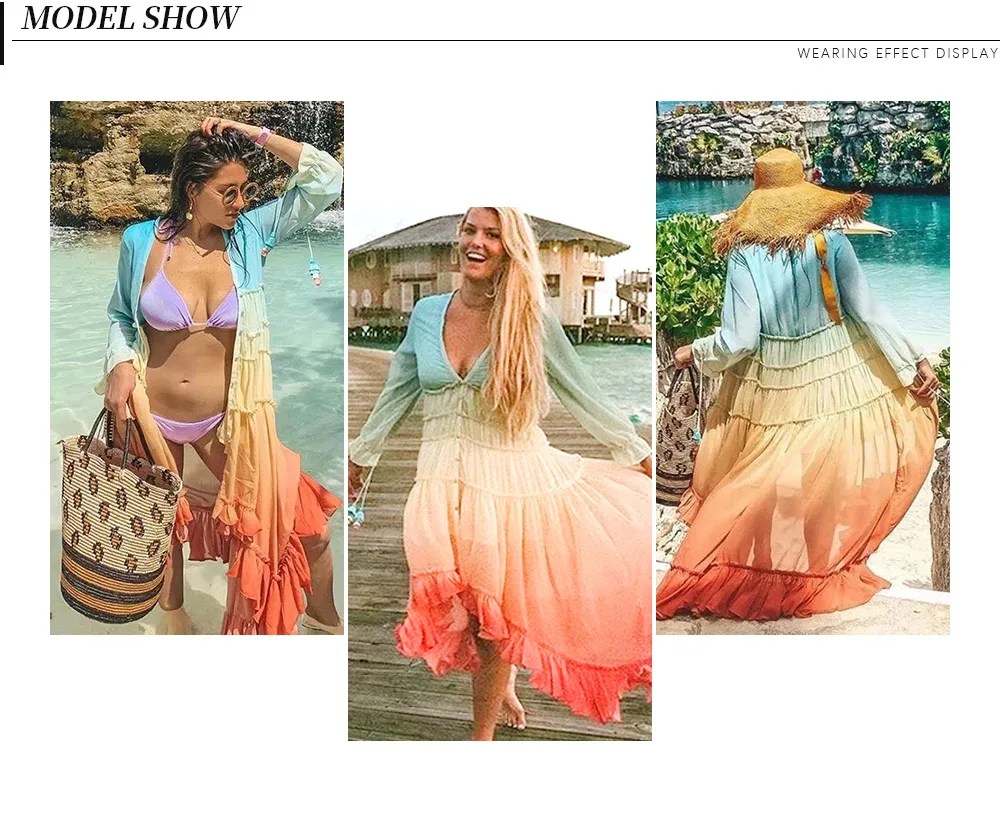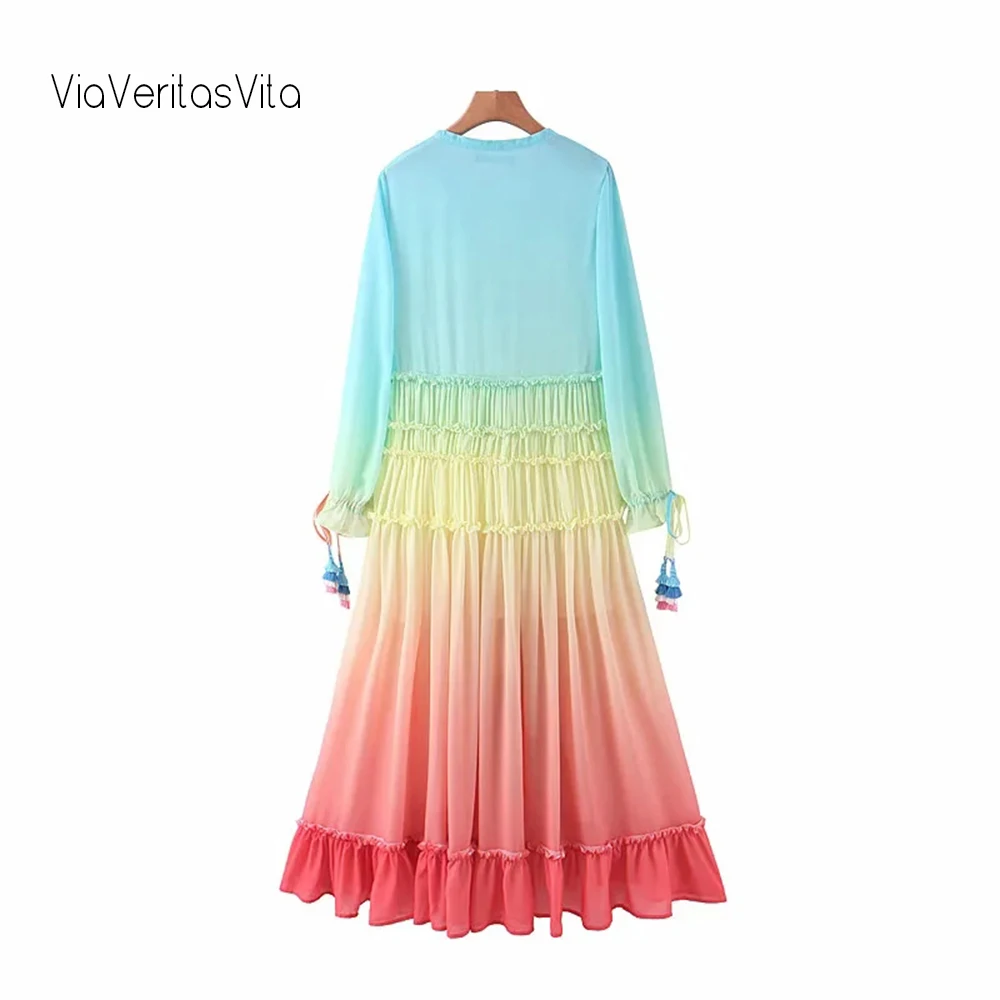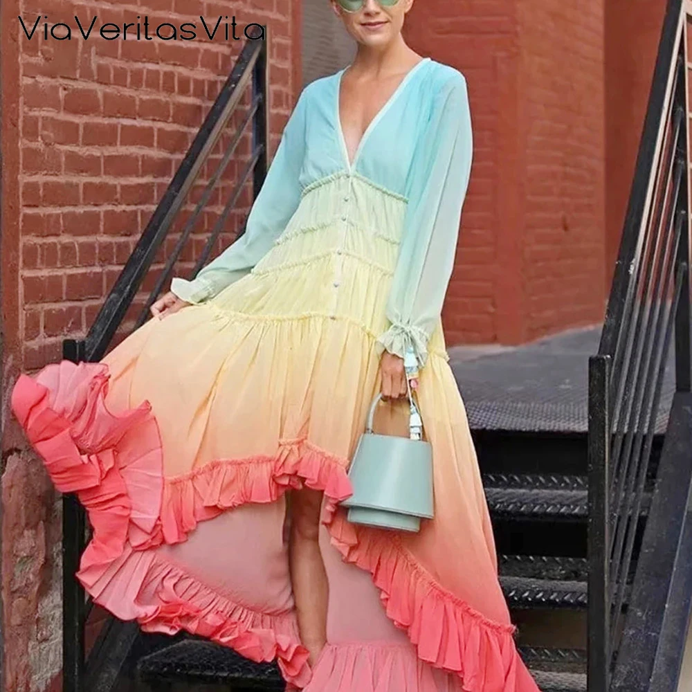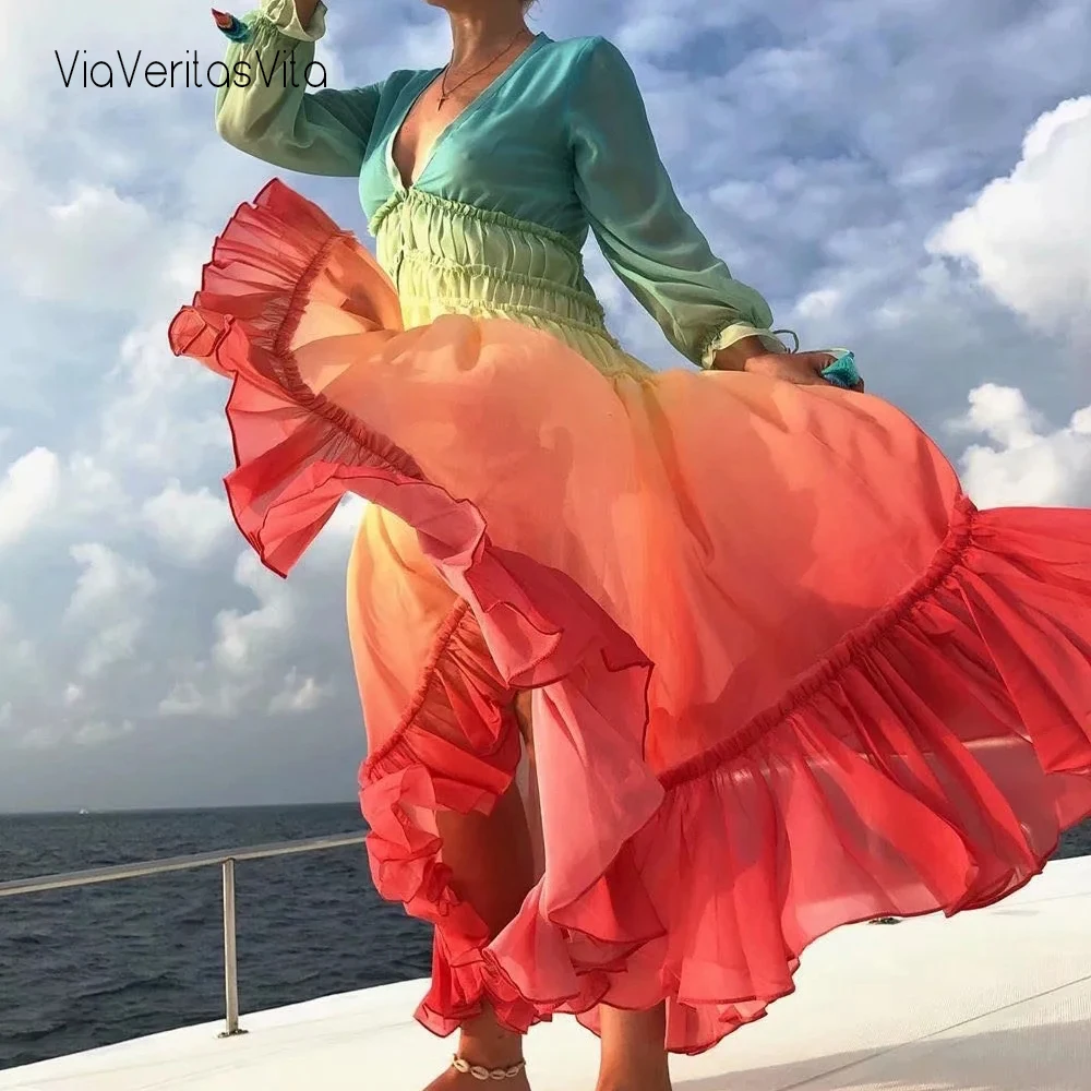 Женское Пляжное Платье макси с радужным принтом, богемное сексуальное платье с длинным рукавом и V-образным вырезом, Платье Бохо с завышенной талией и градиентным рисунком, 2021