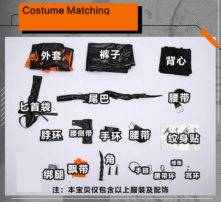 Включает в себя:Пальто, брюки, жилет, хвост, пояс, сумка для кинжала, поясной ремень, шея, браслет, тату-паста, леггинсы, рог, браслет, кольцо, серьги, кольцо на ремень, Продаются отдельно.
