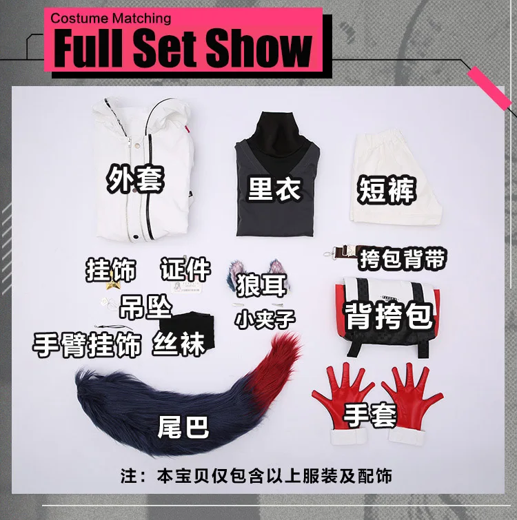 (1) костюм:Пальто + одежда + шорты + повязки + сертификаты + подвеска + волчьи ушки + маленький зажим + повязки на руку + шелковые чулки + хвост + перчатки + сумка на заднюю часть + ремень на Ранец