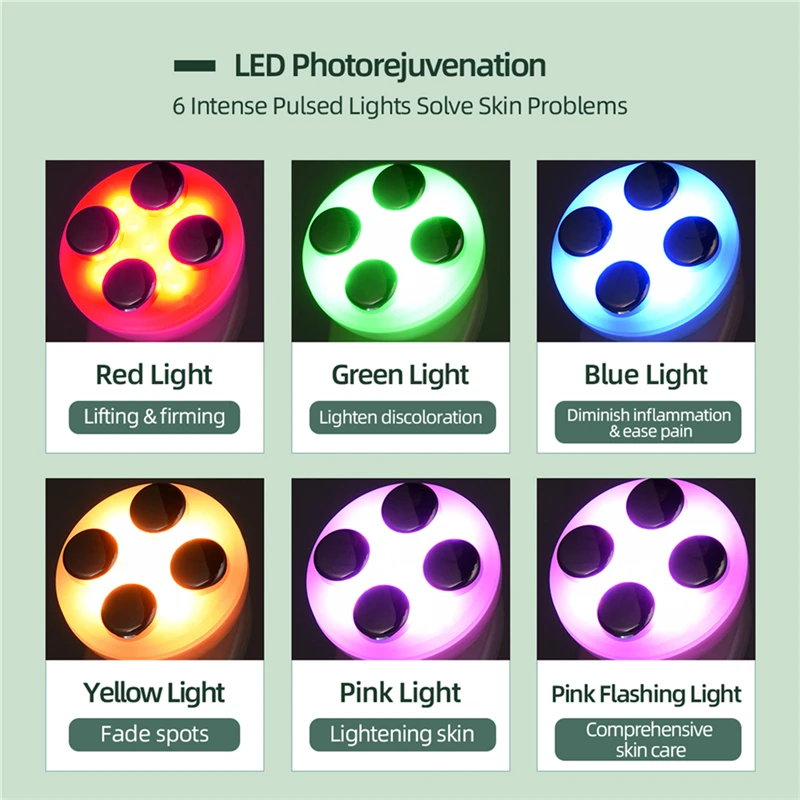 Светодиодные лампы имеют розовый, желтый, зеленый, синий и розовый свет вспышки шесть режимов. Этот светодиодный свет может отбеливать кожу, осветлять тон кожи, способствует регенерации коллагена, подавляет чрезмерную продукцию меланина и сужающихся пор и т. Д.