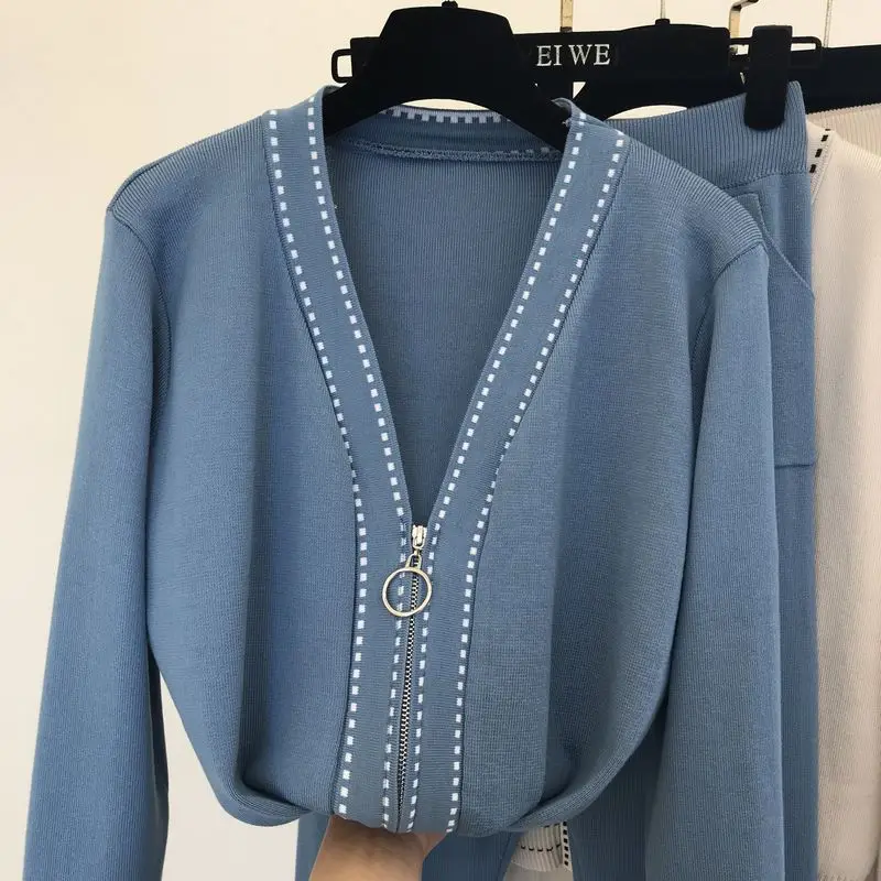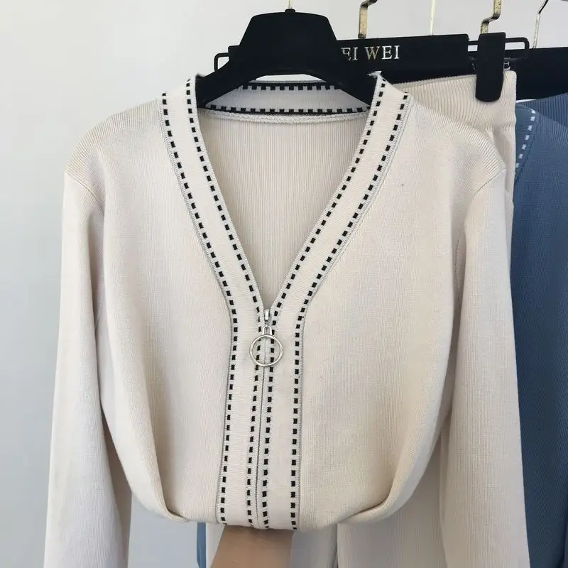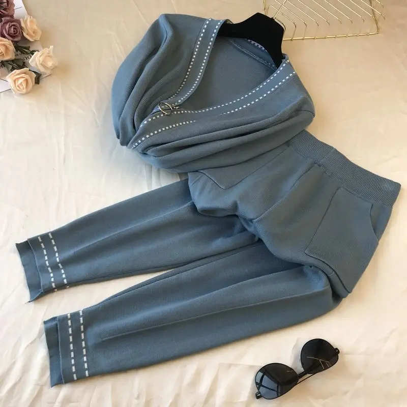 Женский трикотажный костюм из двух предметов, свободный трикотажный свитер с V-образным вырезом и повседневные брюки, весна 2021