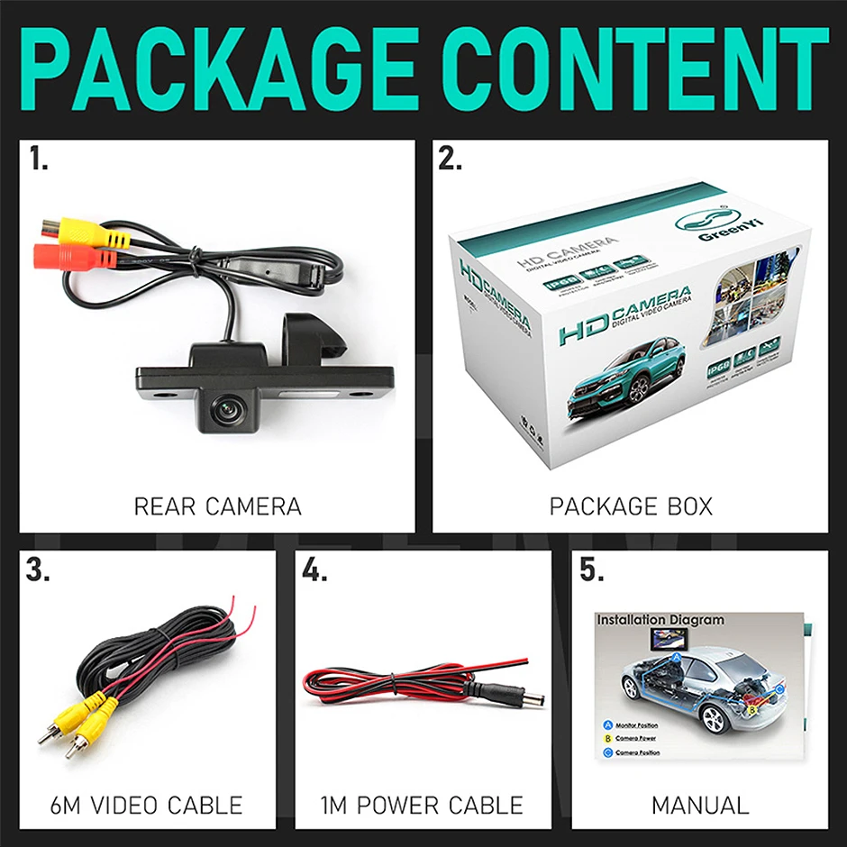 Особенности:* Использование цифрового датчика траектории изображения CCD предназначено для разработки дизайна автомобильного заднего вида с использованием технологии цифровой заливки и программного обеспечения, четкого изображения в дневное время и ниже в ночное время.* От-35 до + 60 температурный диапазон применения, полностью соответствует применению автомобильной среды.* Фабрика после испытания на погружение в воду высокого давления и 12 часов на электрическое испытание на старение, многослойный водонепроницаемый дизайн, действительно высокое давление стирки и погружения* 6 м видео кабель подключения монитора, кабель питания подключения автомобиля задний светильник питания, Реверсивный, реверсивная система мониторинга автоматически начинает работать, вы можете ясно видеть автомобиль после ситуации1. Датчик изображения: CCD 4089T динамическая траектория чипов2. ТВ-система: опция NTSC / PAL3. ТВ-линия: 720 ТВ-линия4. Эффективные пиксели: 960x720 пикселей.5. Низкий светильник ночного видения, 6 м видимое расстояние для ночи.6. Объектив камеры: 4 стеклянных объектива 155 градусов широкий угол.7. Мощность: 12 В постоянного тока8. Длина видеокабеля: 6 м9. Длина кабеля питания: 1 м10. Подходит для Android dvd-плеера и любого TFT автомобильного парковочного монитора.Посылка включает в себя:1. Камера траектории заднего вида2. Self-винт стук3. Видео кабель 6 м4. Кабель питания5. Руководство пользователя