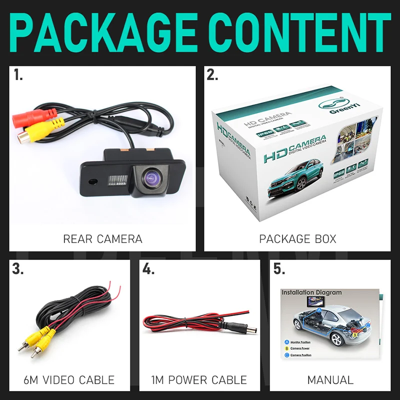 Особенности:* Использование цифрового датчика траектории изображения CCD предназначено для разработки дизайна автомобильного заднего вида с использованием технологии цифровой заливки и программного обеспечения, четкого изображения в дневное время и ниже в ночное время.* От-35 до + 60 температурный диапазон применения, полностью соответствует применению автомобильной среды.* Фабрика после испытания на погружение в воду высокого давления и 12 часов на электрическое испытание на старение, многослойный водонепроницаемый дизайн, действительно высокое давление стирки и погружения* 6 м видео кабель подключения монитора, кабель питания подключения автомобиля задний светильник питания, Реверсивный, реверсивная система мониторинга автоматически начинает работать, вы можете ясно видеть автомобиль после ситуации1. Датчик изображения: CCD 4089T динамическая траектория чипов2. ТВ-система: опция NTSC / PAL3. ТВ-линия: 720 ТВ-линия4. Эффективные пиксели: 960x720 пикселей.5. Низкий светильник ночного видения, 6 м видимое расстояние для ночи.6. Объектив камеры: 4 стеклянных объектива 155 градусов широкий угол.7. Мощность: 12 В постоянного тока8. Длина видеокабеля: 6 м9. Длина кабеля питания: 1 м10. Подходит для Android dvd-плеера и любого TFT автомобильного парковочного монитора.Посылка включает в себя:1. Камера траектории заднего вида2. Self-винт стук3. Видео кабель 6 м4. Кабель питания5. Руководство пользователя