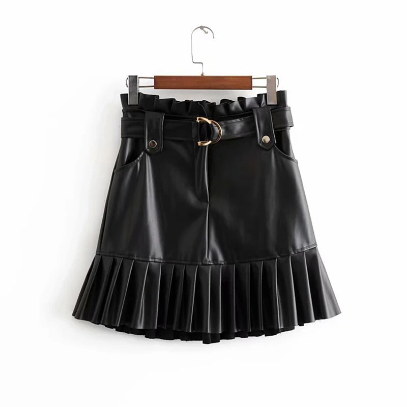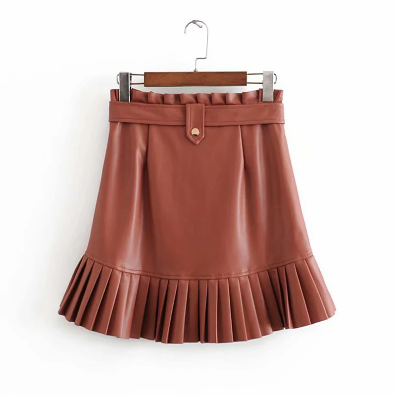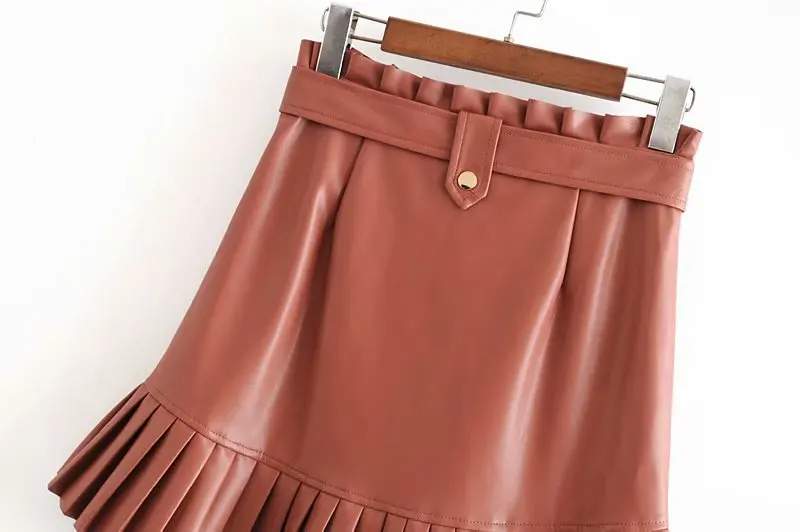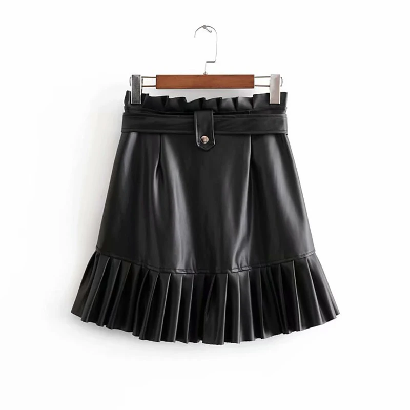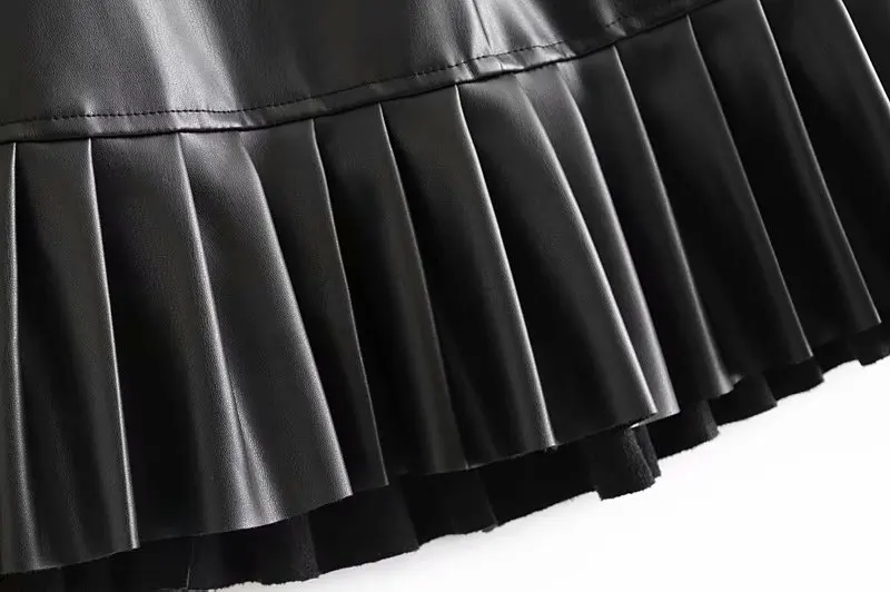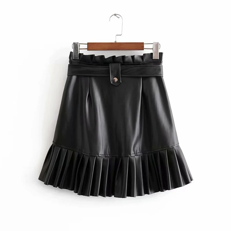 Женская плиссированная мини-юбка из искусственной кожи, на молнии, с завязками на поясе