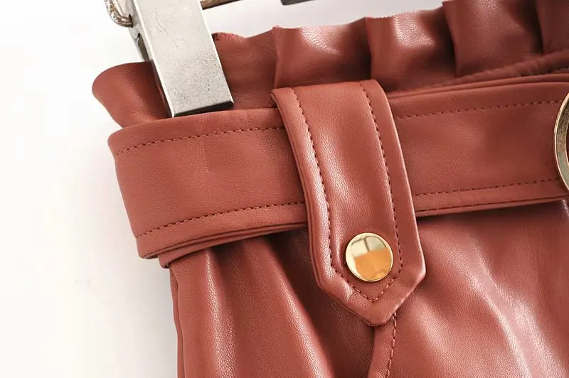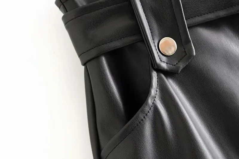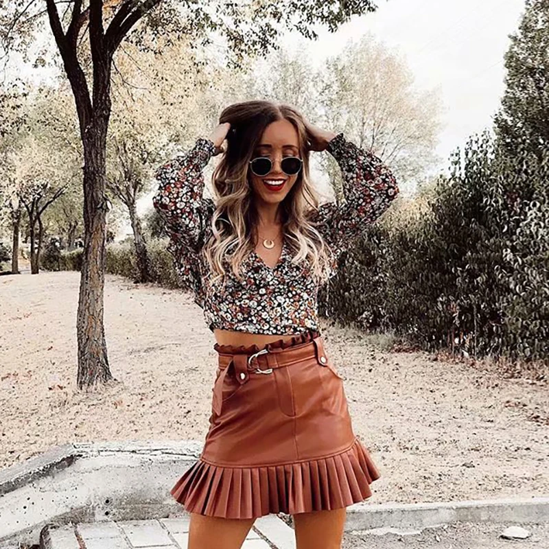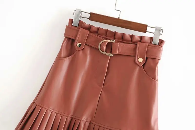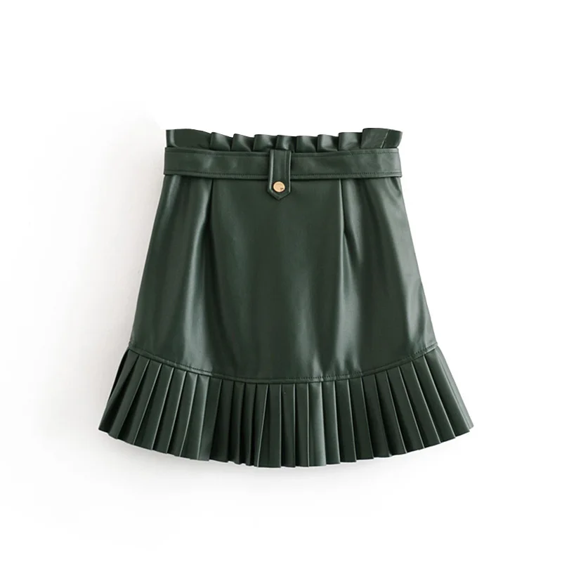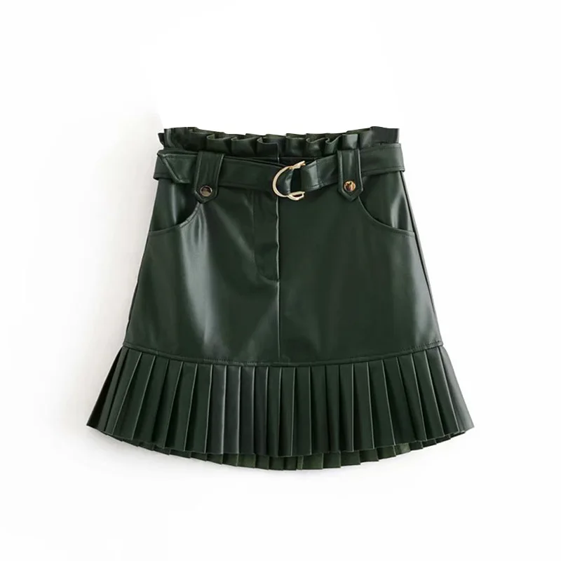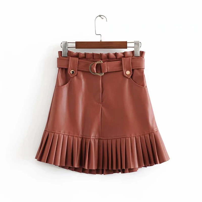 Женская плиссированная мини-юбка из искусственной кожи, на молнии, с завязками на поясе