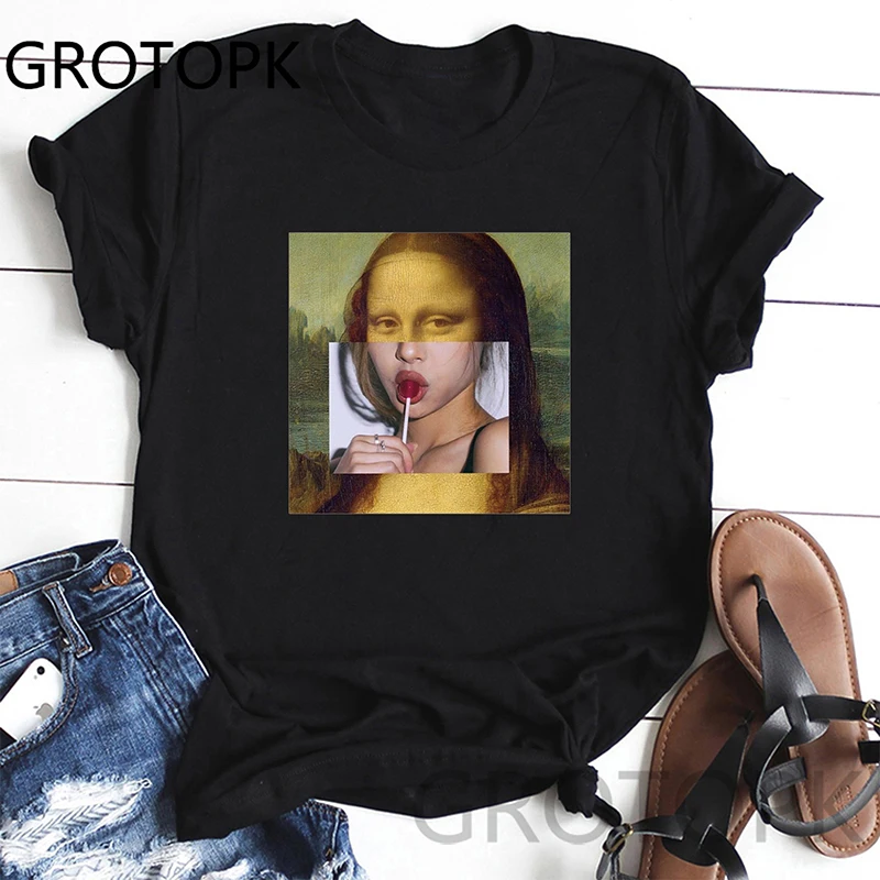 Футболка женская летняя свободная с принтом, смешная графическая рубашка с принтом живота, Мона Лиза