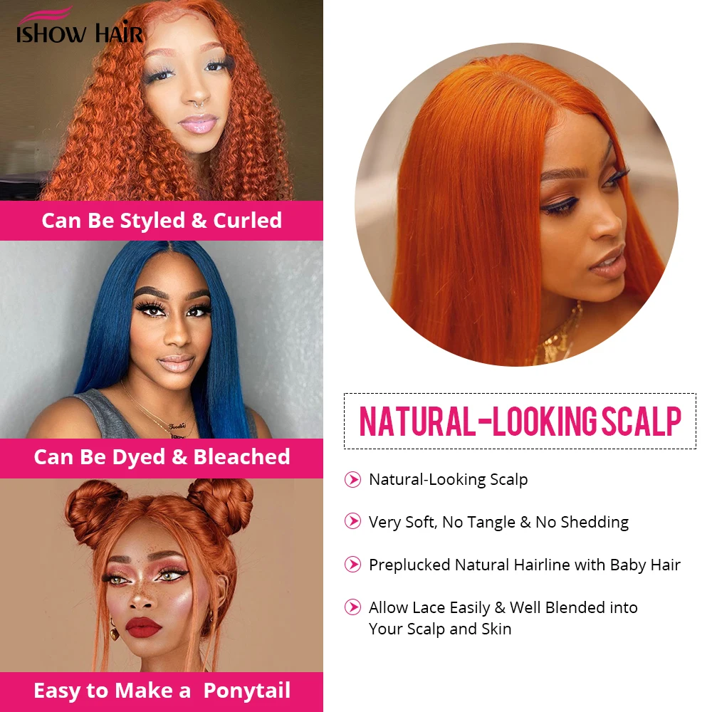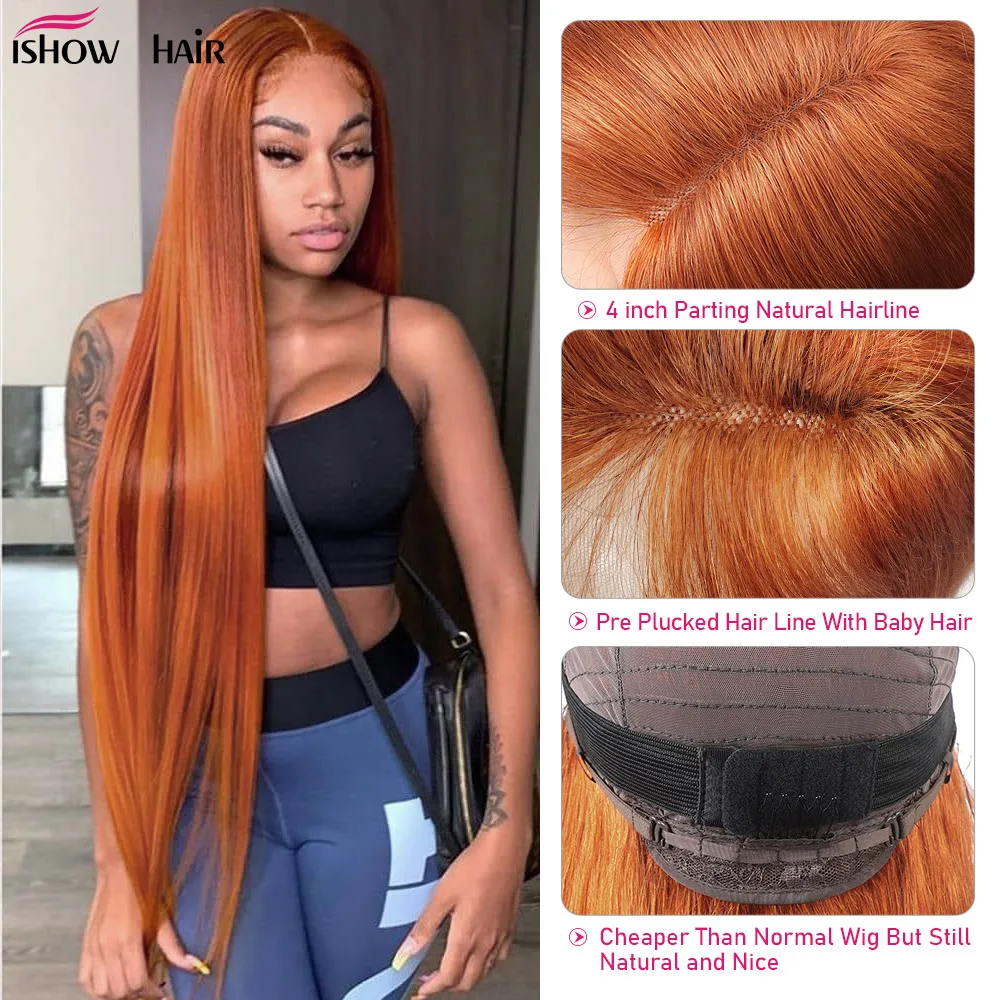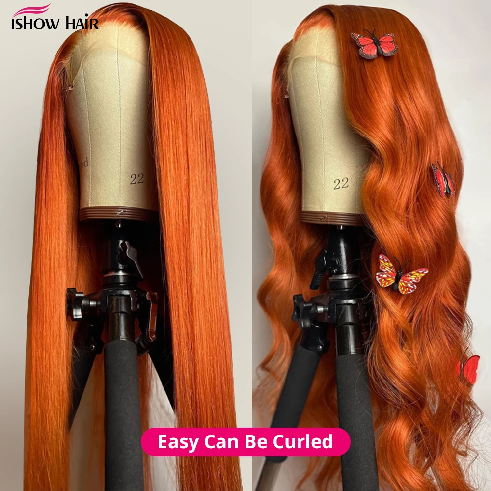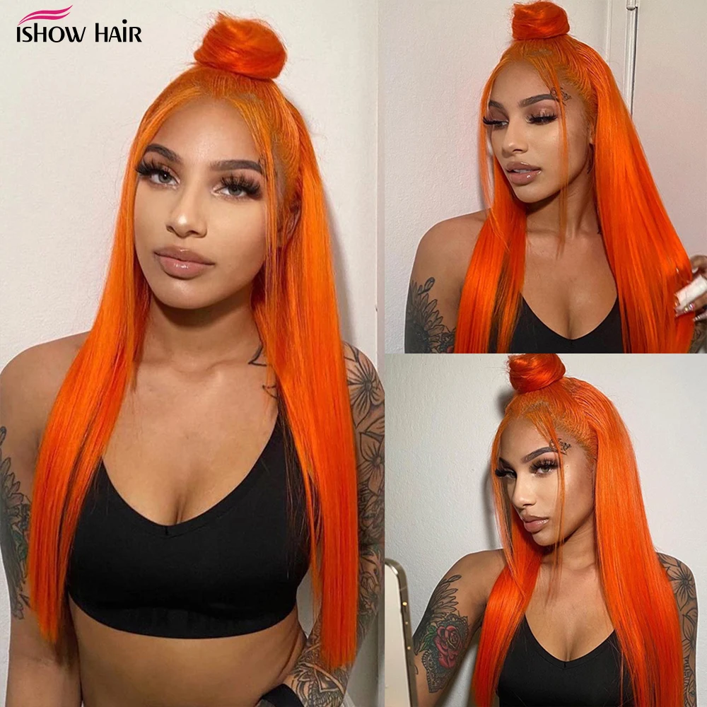 Ishow Ginger прямой парик на сетке спереди, парики из человеческих волос оранжевого цвета, предварительно выщипанные HD прозрачные парики на сетке спереди, бразильский парик из волос