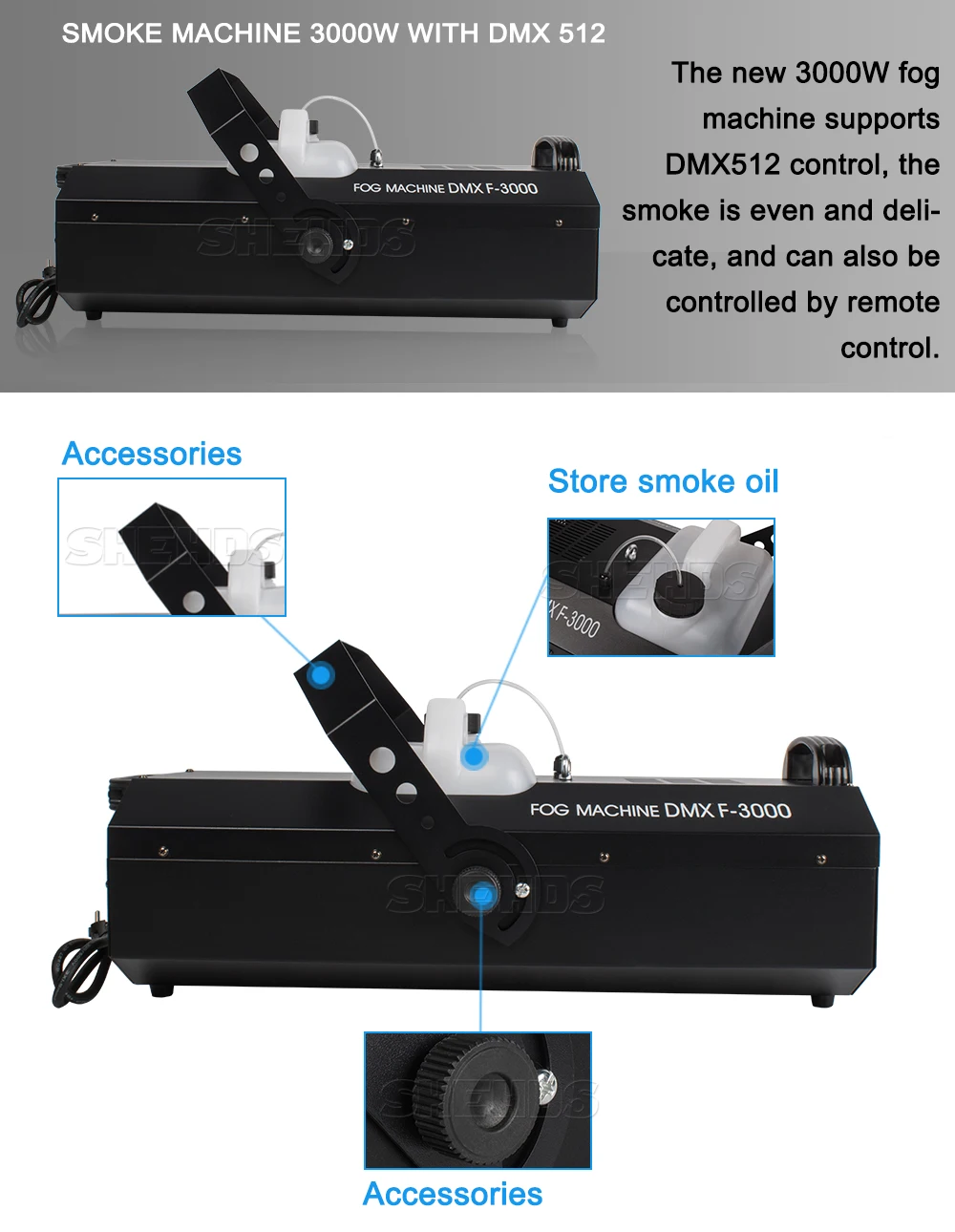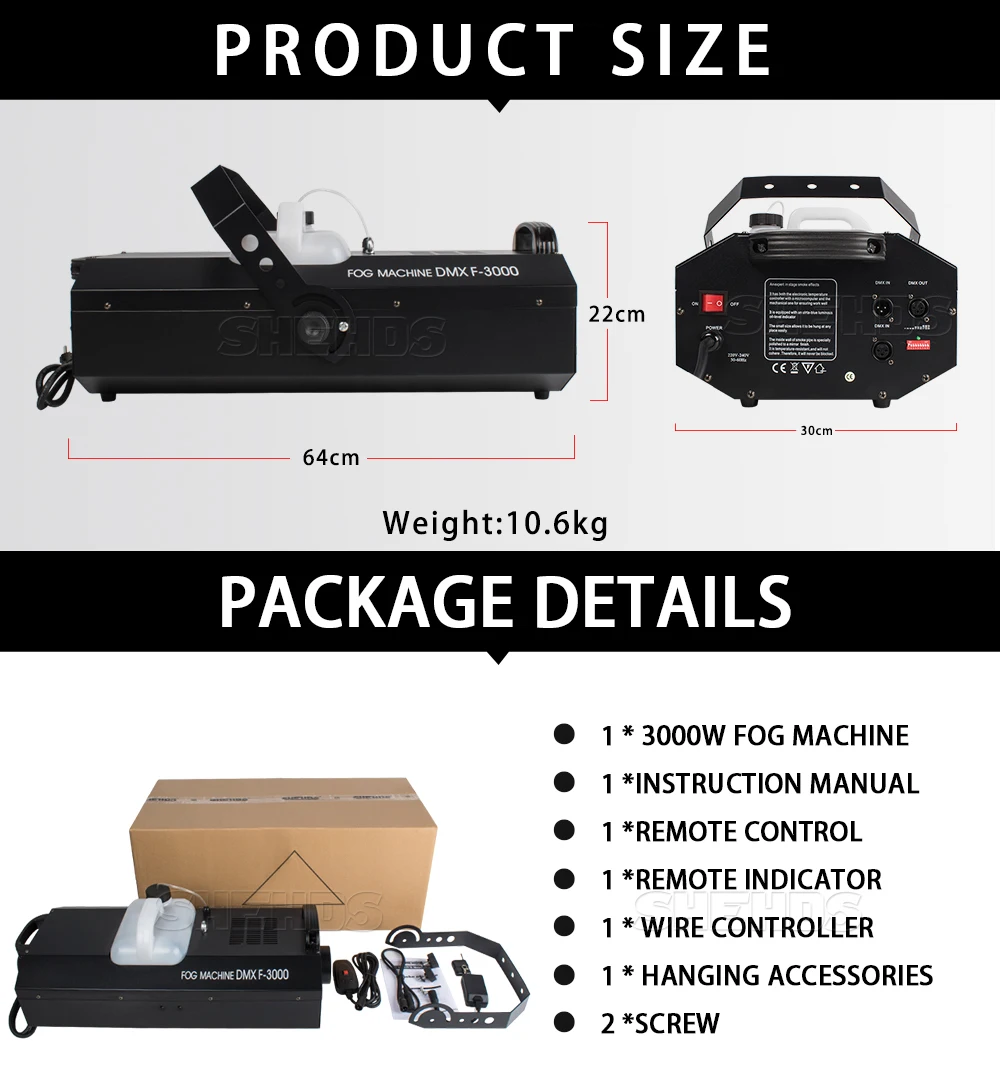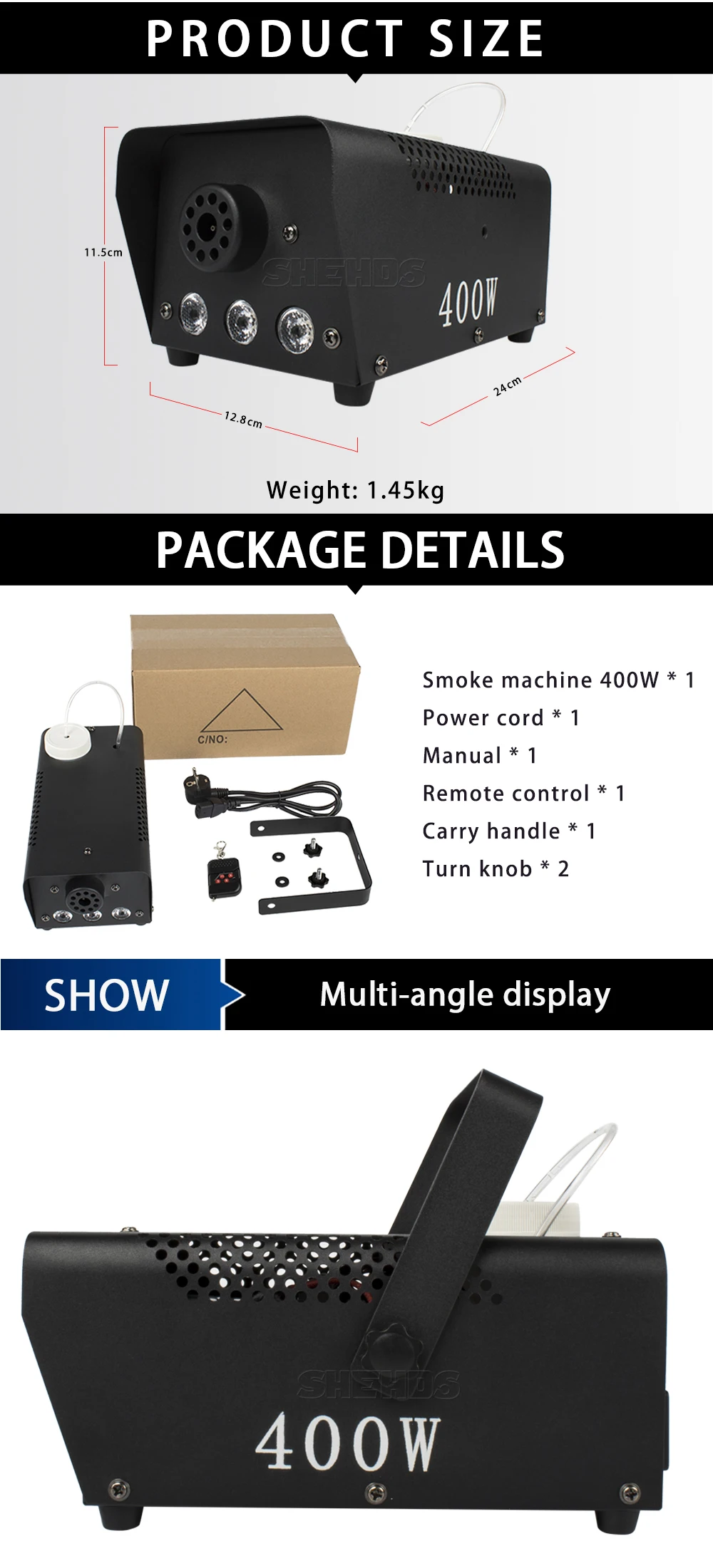 Опишите подробности вышеперечисленных преимуществ товара, привлекая* Номер модели: SHE-Smo400WRGB ; SHE-Smo900WRGB ; SHE-Smo1500W ; SHE-Smo1500WDMX ; SHE-Smo3000W;SHE-Smo3000WDMX* Входное напряжение: AC90--240V,50 -- 60 Гц* Потребляемая мощность: 400 Вт RGB 3 в 1 ; 900 Вт RGB 3 в 1 ; 1500 Вт; 1500 Вт Wite DMX512 ; 3000 Вт; 3000WDMX* Источник цвета: цвет RGB 3 в 1 или без цвета* Время нагрева: 4-5 минут; 8 минут; 8 минут; 8 минут; 10 минут; 10 минут* Емкость смога: 0,5 л; 2 л; 3 л; 3 л; 6 л; 6 л* Расстояние распыления: 2,5-3 м; 10 м; 12 м; 12 м; 12 м; 12 м* Выход: 6000 куб. ff/min ; 6000cu.ff/мин; 25000 куб. Фут/мин; 25000 куб. Фут/мин; 40000 куб. ft / min;40000cu. Фу/мин* Управление: беспроводной пульт дистанционного управления* Вес продукта: 2 кг; 4 кг; 5 кг; 5 кг; 11 кг; 11 кг* Сертификат: CE, ROHS, UL, SAA* Гарантия: в течение 1 года мы можем бесплатно отремонтировать, предоставить любые аксессуары или отправить Новые товары.* Вилка: отправляет вилки, соответствующие требованиям: вилки ЕС, вилки США, вилки Австралии, вилки Великобритании и т. д.* Использование помещений: свадьба, сцены, ночные клубы, дискотеки, отели, магазины, семейный день рождения, подходит для диджеев и т. д.Содержимое упаковки1 х дымовая машина1 х Руководство пользователя1 х кронштейн (ручка) с винтомКабель питания 1 × 1,2 м1 × Дистанционное управление и обеспечение доверия вашим потенциальным пользователям.