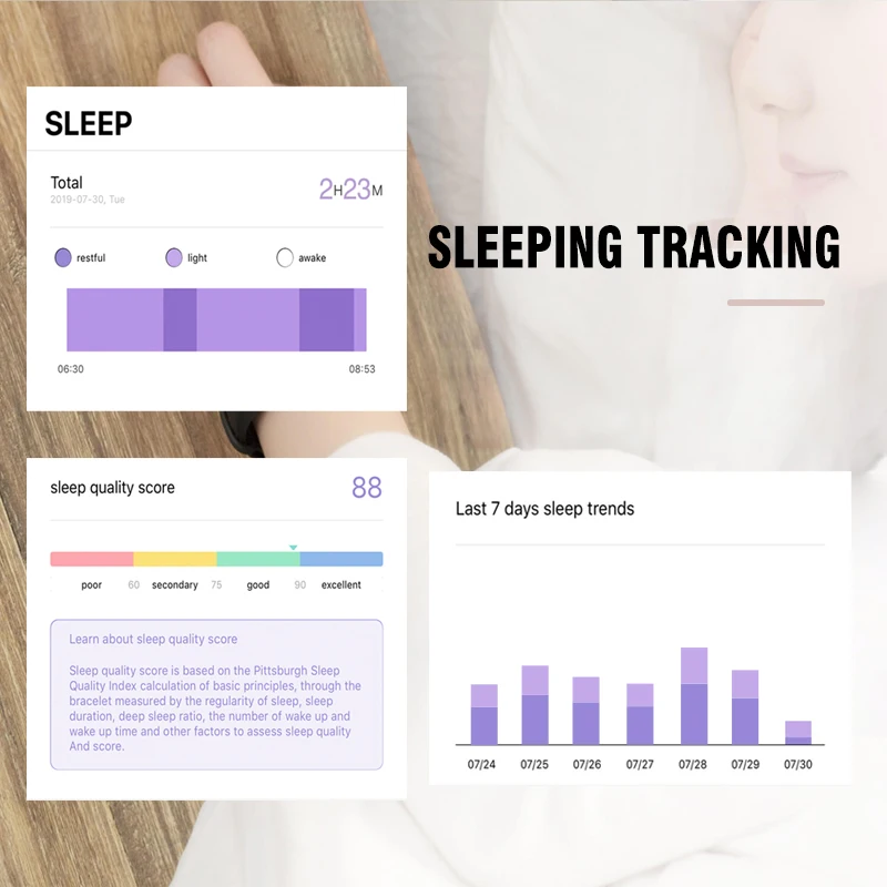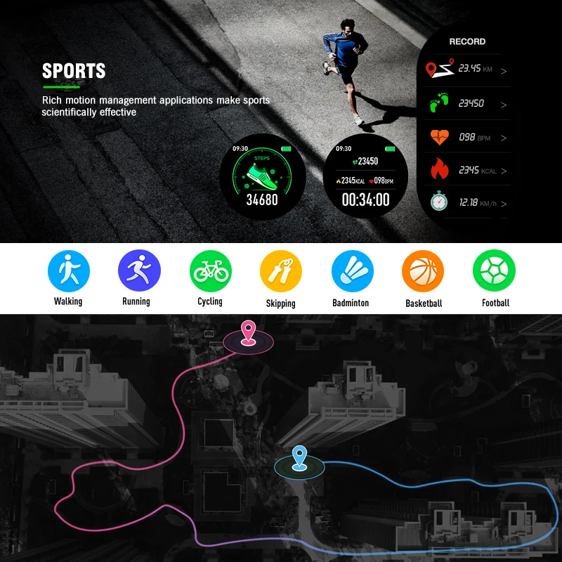 Автоматически записывает шаги бега, скорость, частоту сердечных сокращений, расстояние, сожженные калории и ежечасную активность и стационарное время.