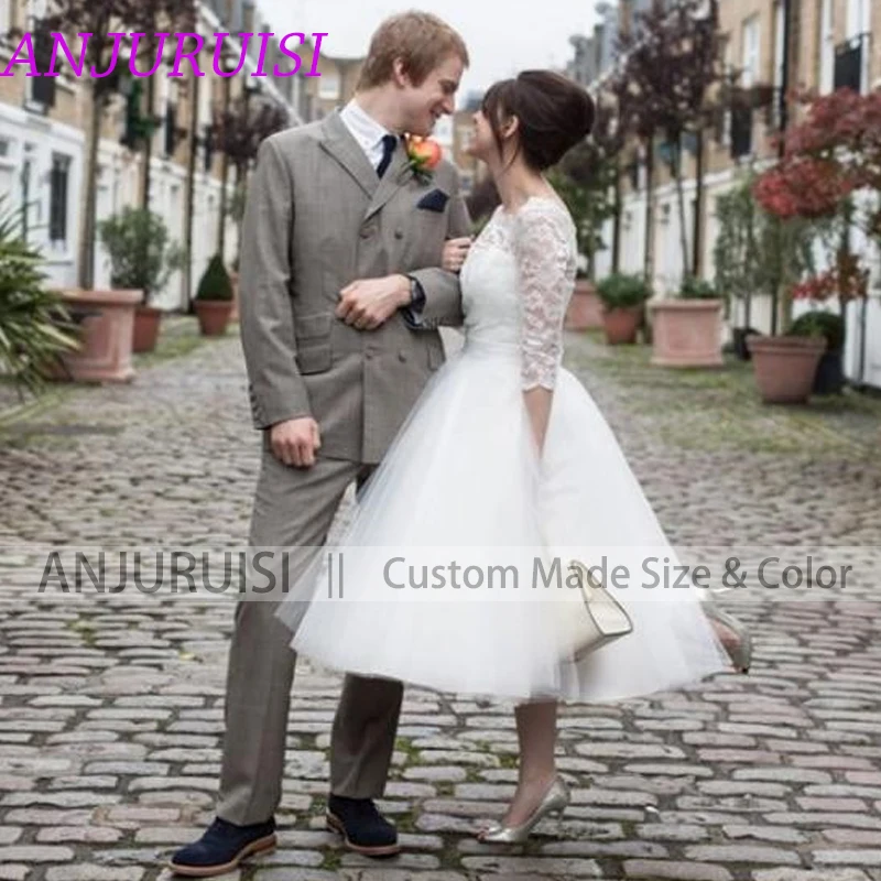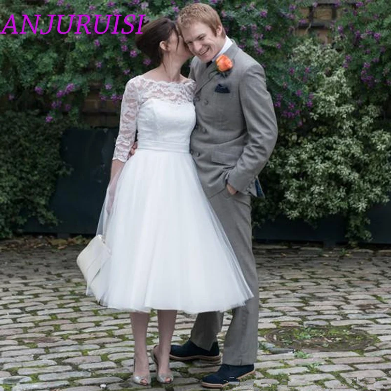 Женское свадебное платье ANJURUISI, простое, с рукавами 34, кружевное, недорогое, ТРАПЕЦИЕВИДНОЕ, с поясом, 2020