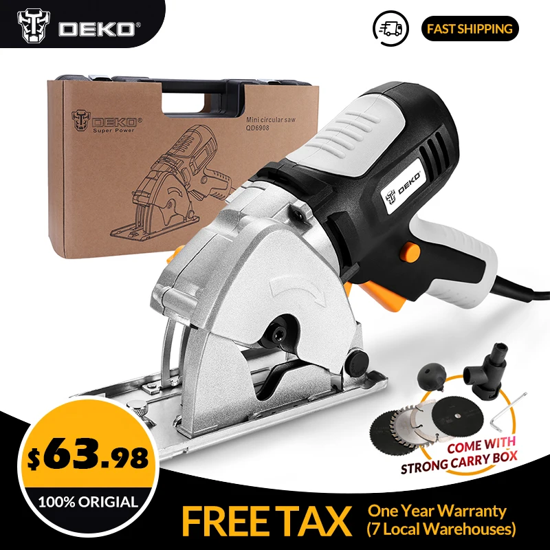 Дисковая пила DEKO Mini (QD6908)-это мощная и функциональная дисковая пила. Нет необходимости в громоздкой циркулярной Пиле, когда компактная циркулярная пила будет резать дерево/древесные материалы/пластик/плитку/печатные платы/Стекловолокно армированный пластик в то же время с легкостью и комфорт, благодаря легкому и компактному дизайну. С мини-циркулярной пилой DEKO легко, удобно и управляемо справляется с любой из этих работ одной рукой. А эргономичная рукоятка управления делает его самым быстрым, простым и удобным в использовании инструментом в ящике для инструментов.