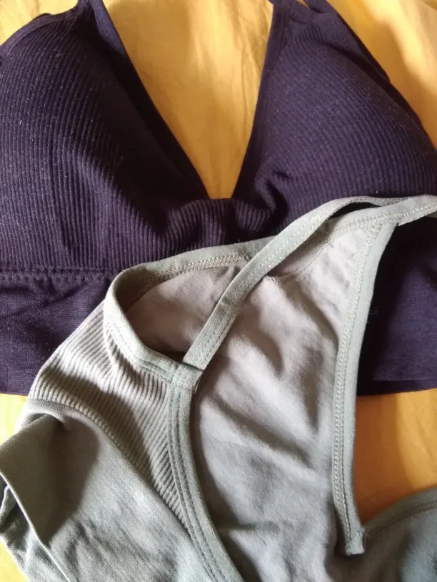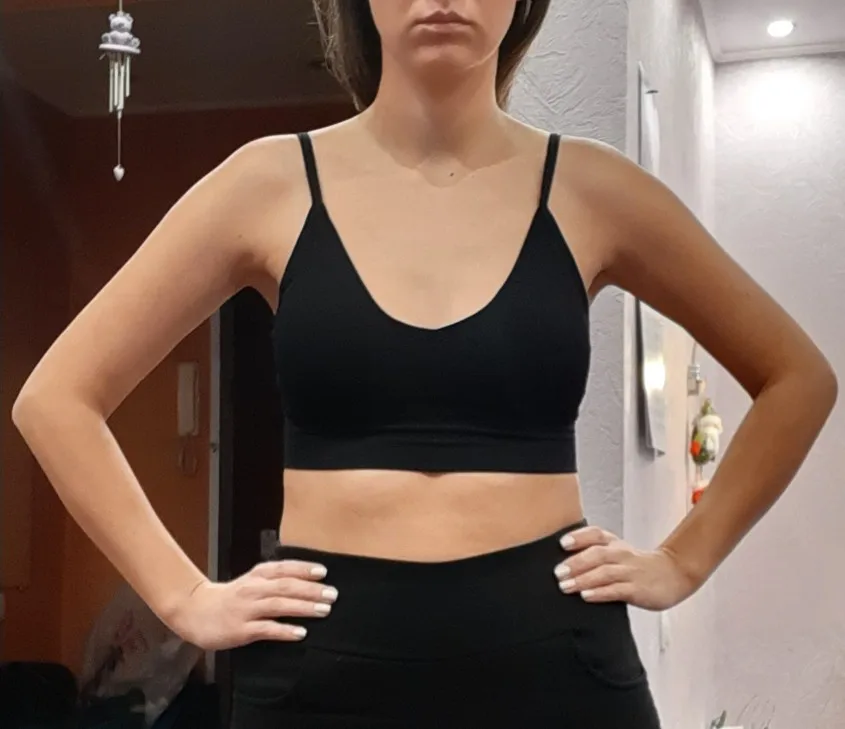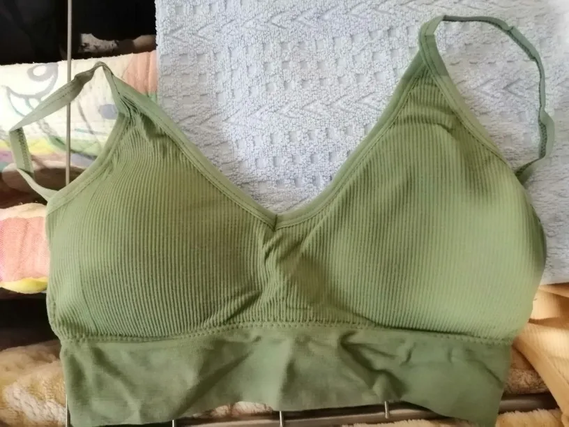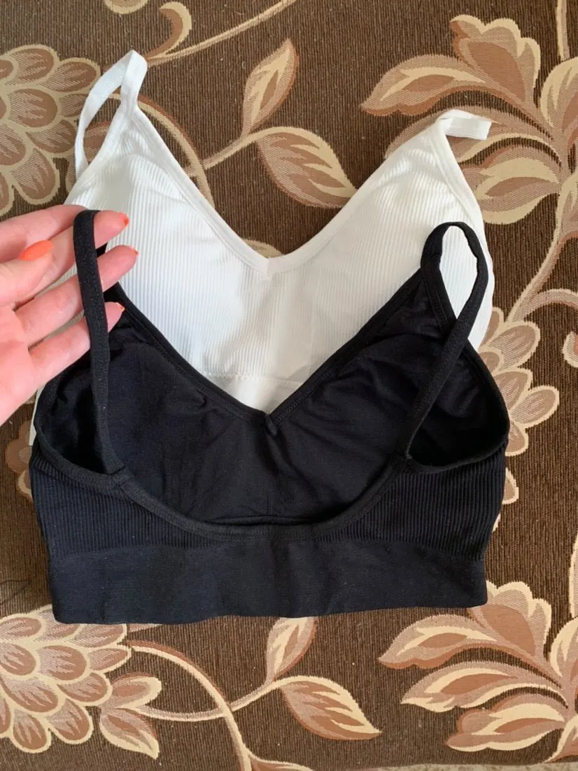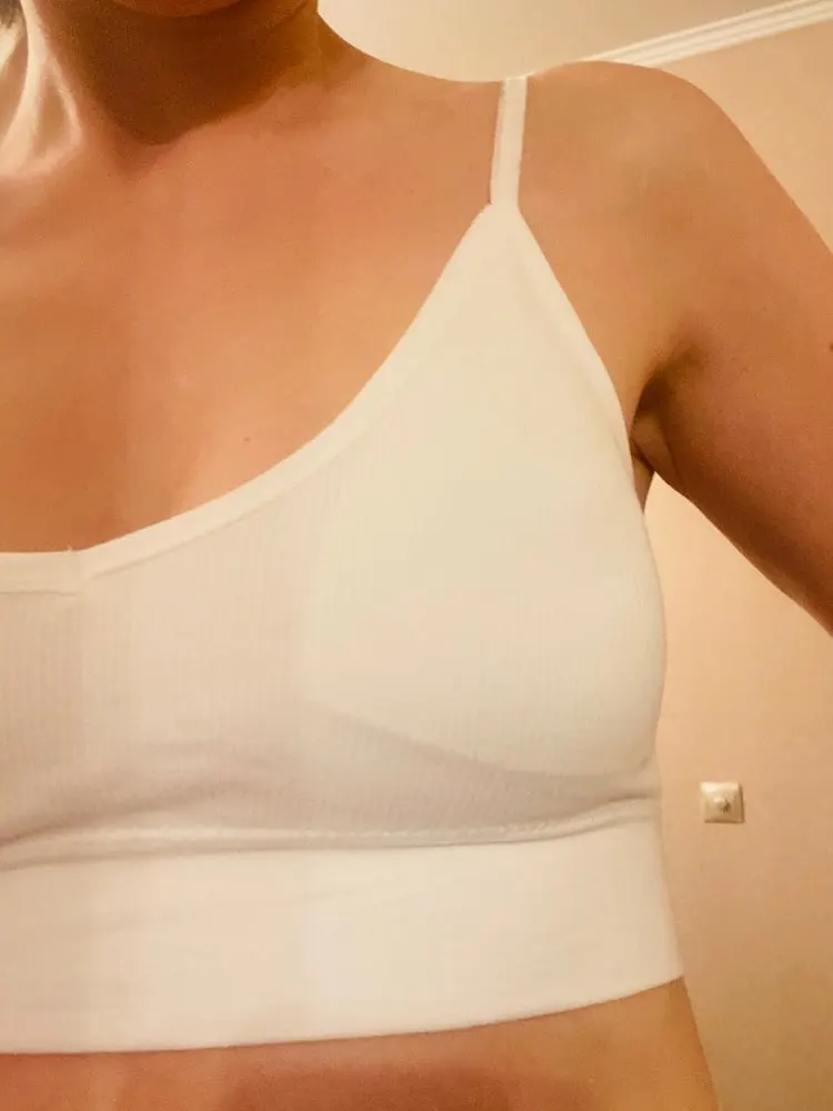 В белом просвечивается поролон, поэтому убрала. Странные лямки, как будто для широких плеч. Но комфортно и даже не слетают. Ниточки торчат, но для такой цены это норм. Материал хороший, как у любого бесшовного белья.