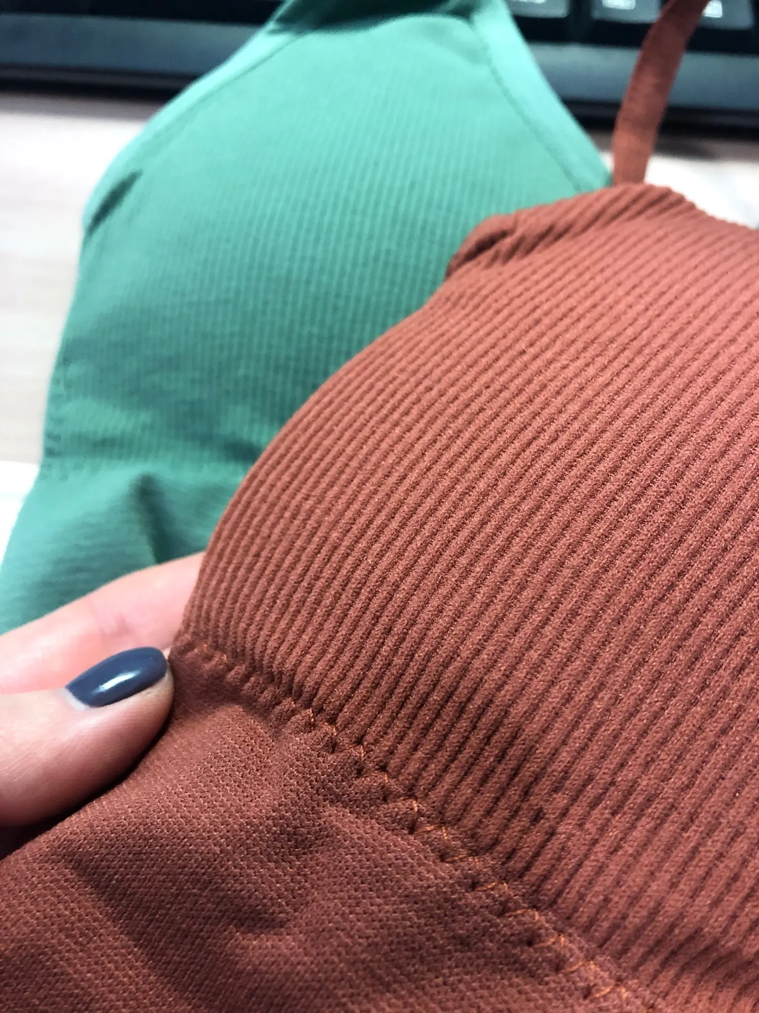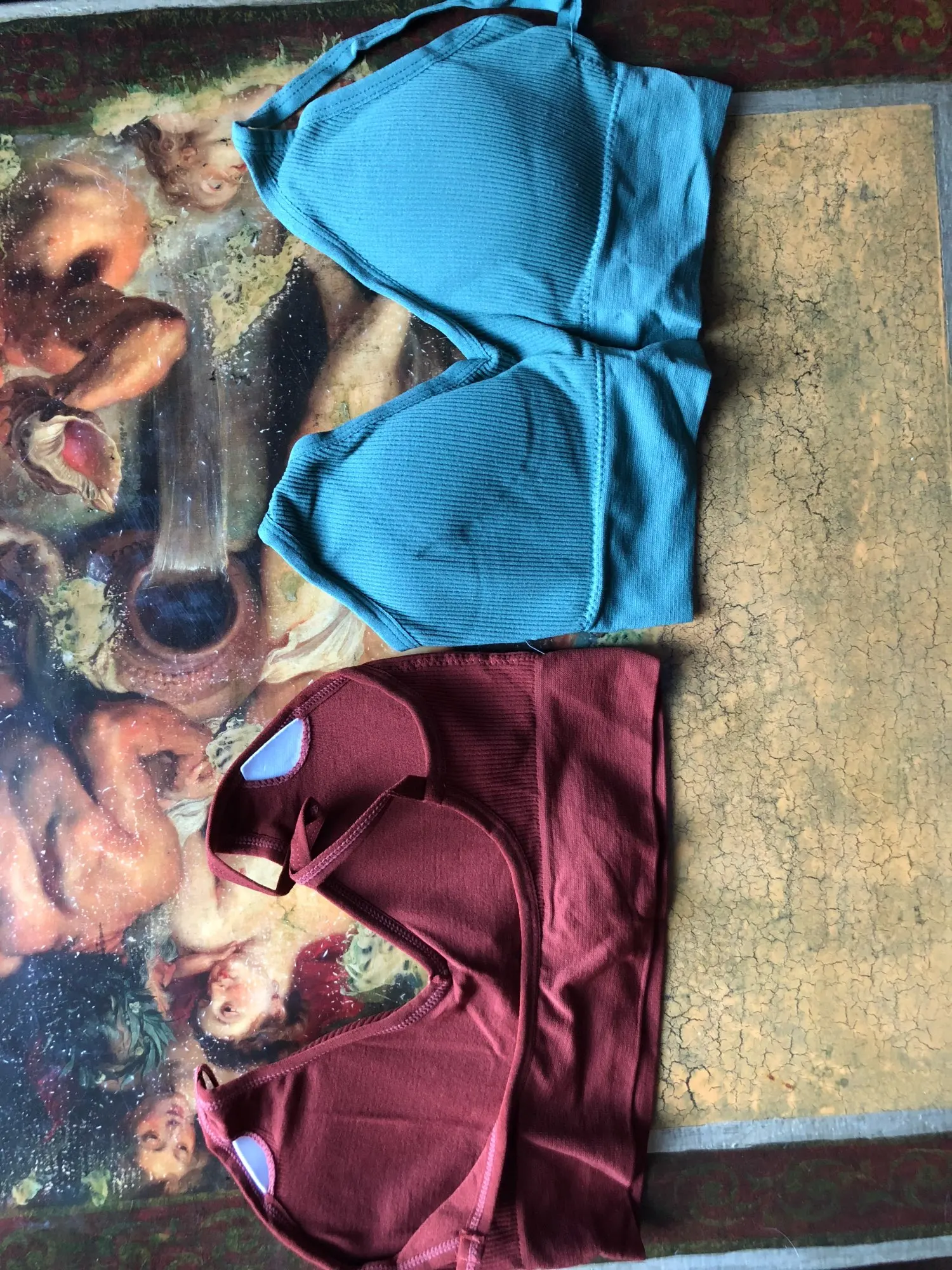 Передний шов кривой на обоих топах и на одном торчат нитки. Запах есть, но выстирывается. Доставка быстрая - 2 недели. Продавец отзывчивый, быстро отвечает, просила отправить мне зелёный и кофе цвета, такого сочетания нет, но продавец учёл моё пожелание. Спасибо ему огромное