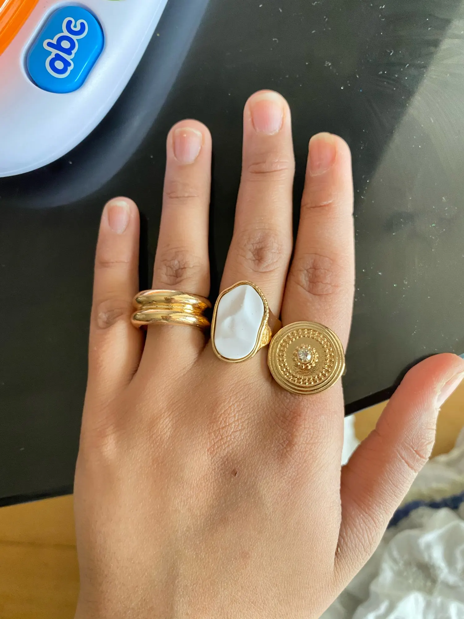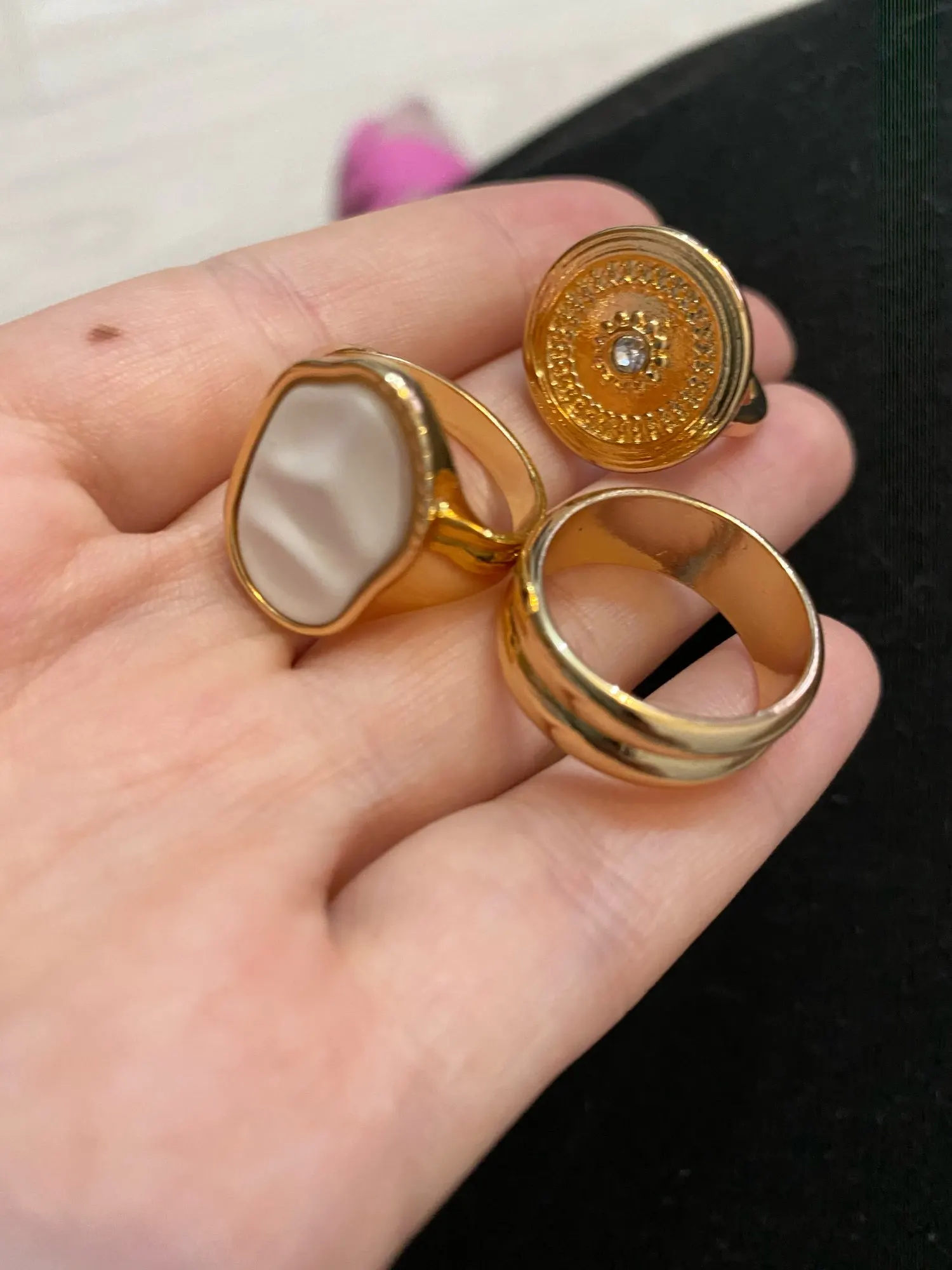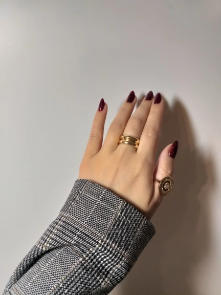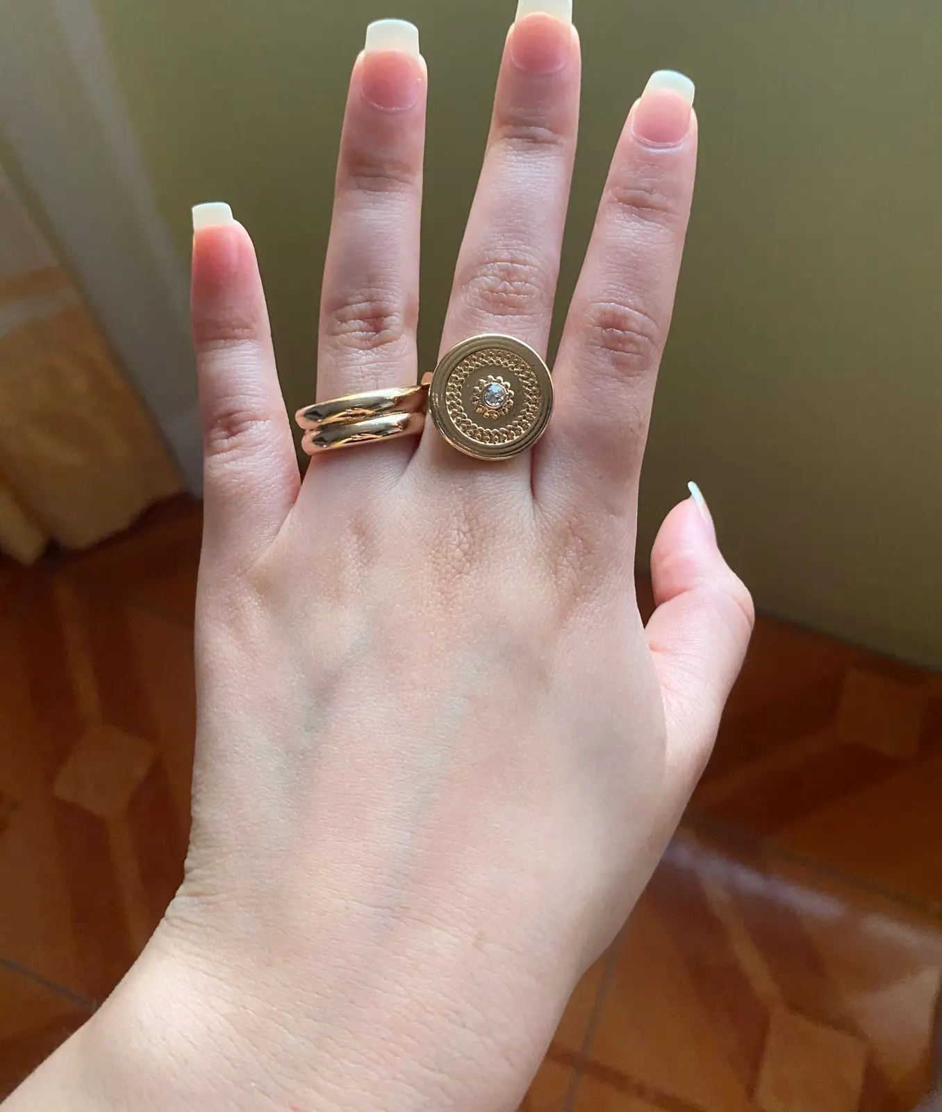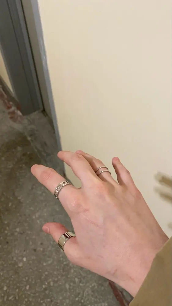 Всё как на картинке. Выполнено качественно. Все три кольца одного размера, поэтому носить на разных пальцах не очень удобно. Размер максимум 17. На 17,5 уже не лезет.