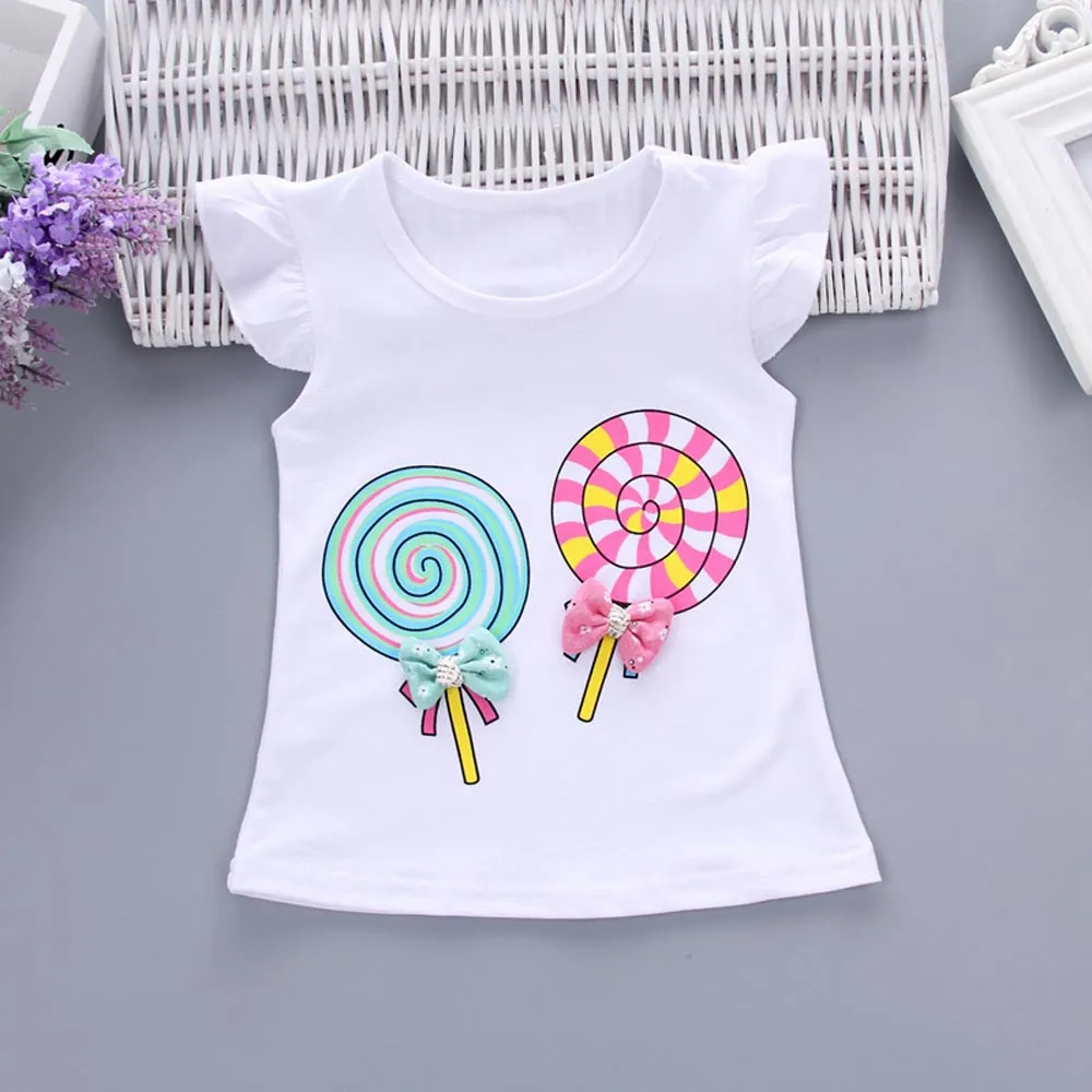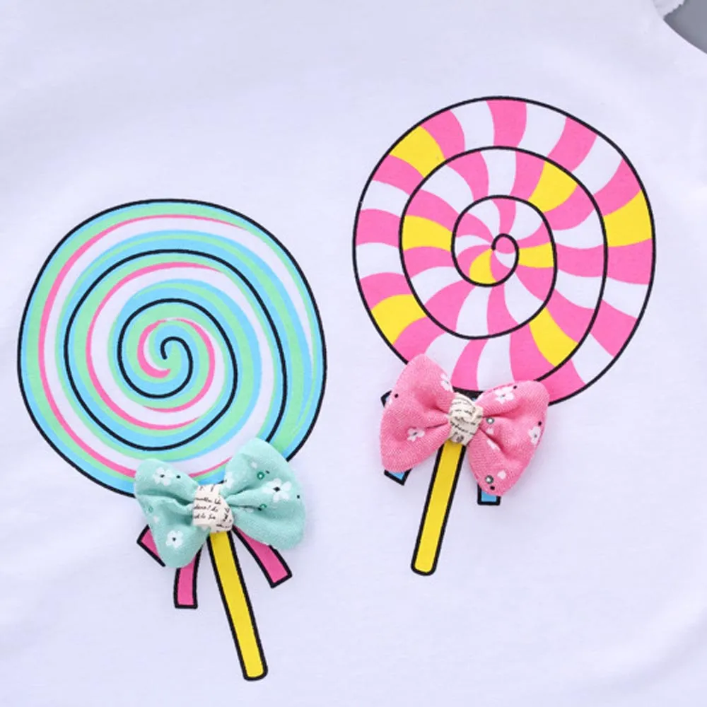 2020 Одежда для новорожденных; Сезон весна-лето-осень Милая Спортивная одежда для девочек из 2 предметов футболка с рисунком леденца топ + короткие штаны; Костюм; Комплект