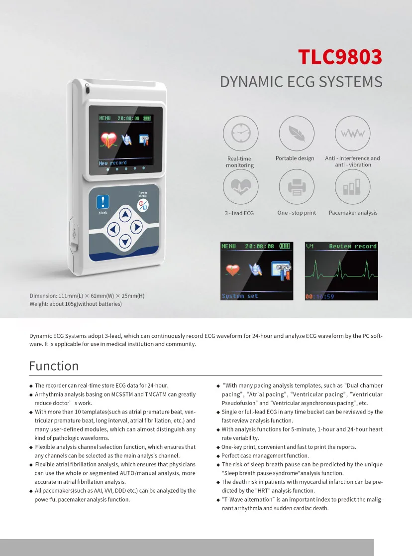 В динамических системах ЭКГ используются 3 отверстия, которые могут непрерывно записывать форму волн ЭКГ в течение 24 часов и анализировать форму волн ЭКГ с помощью программного обеспечения ПК. Применим для использования в медицинских учреждениях и общинах.