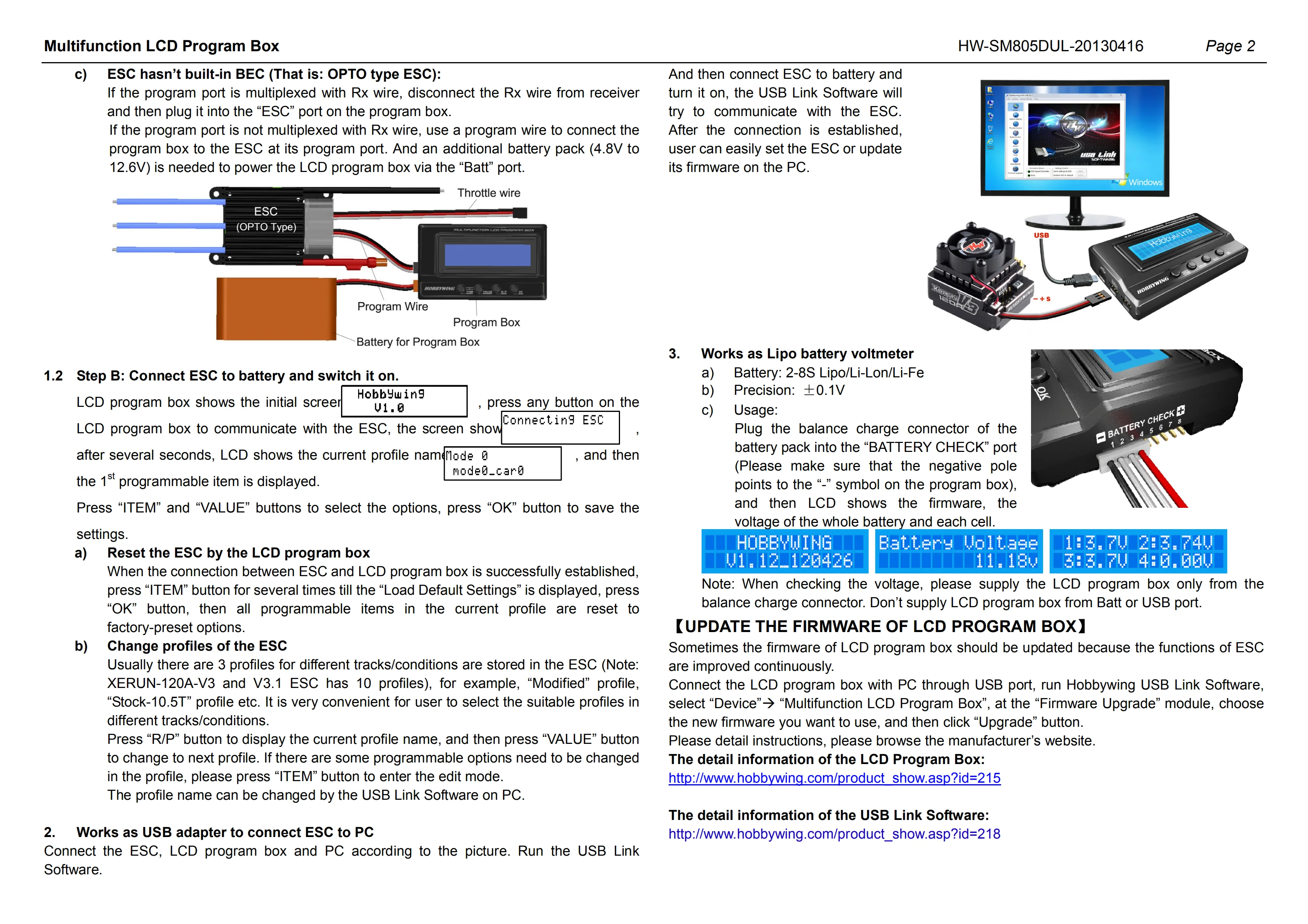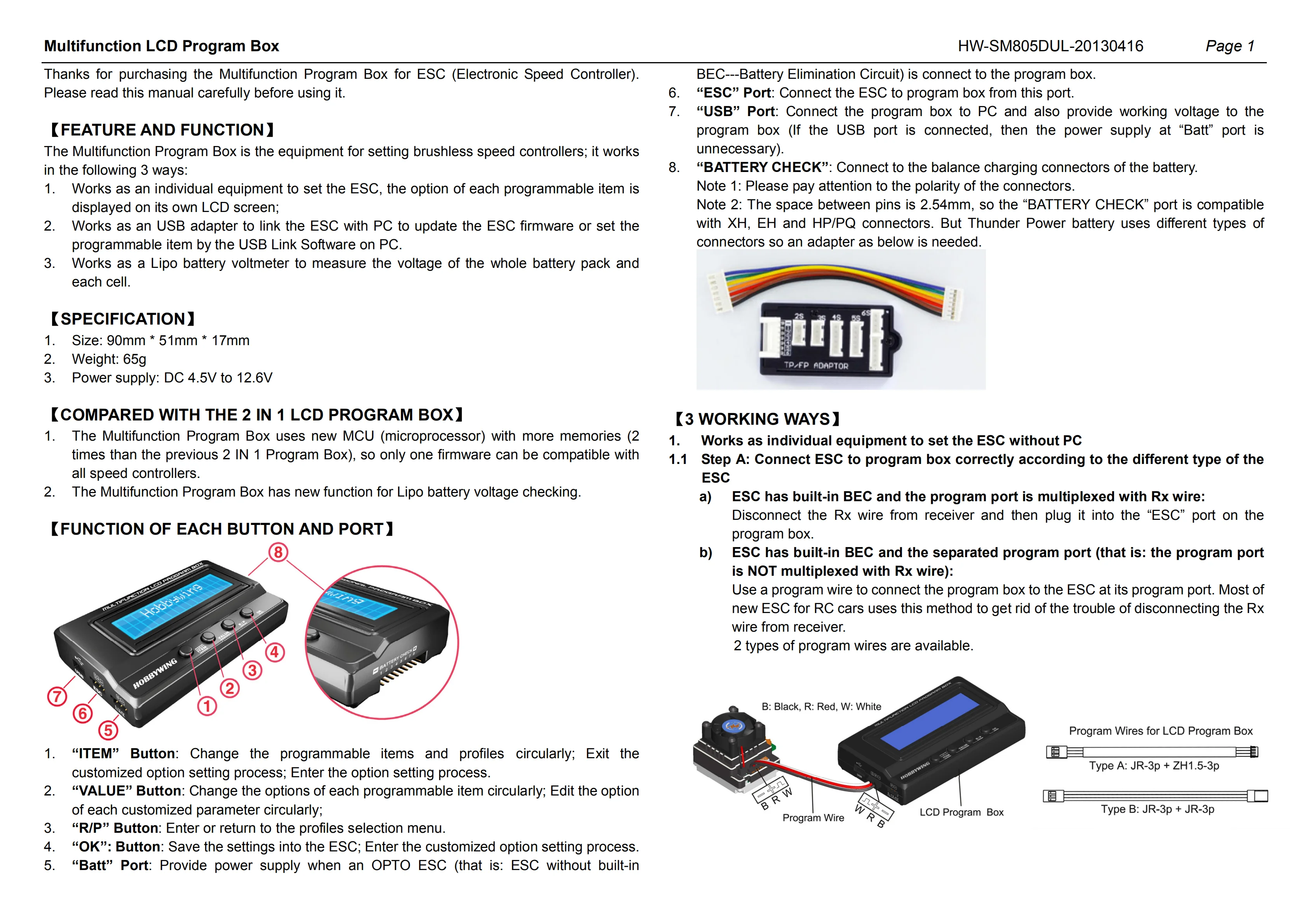 Многофункциональный программный блок-это оборудование для настройки бесщеточных контроллеров скорости: он работает следующими 3 способами:1. Работает как индивидуальное устройство для установки ESC, значение каждого параметра отображается на ЖК-экране2. Работает в качестве USB-адаптера для подключения ESC к ПК для обновления прошивки ESC или установки ESC с помощью программного обеспечения HOBBYWING USB link3. Работает как вольтметр Lipo для измерения напряжения всего аккумуляторного блока или каждого элементаПараметрыРазмер: 90 мм x 51 мм x 17 ммВес: 65 гИсточник питания: от 4,5 в до 12,6 В постоянного токаЭтот многофункциональный программный блок с ЖК-дисплеем подходит для следующего ESC:Платиновый вертолет/самолет ESCXERUN & EZRUN series Car ESC (версии 2,0 и 2,1)XERUN-120A V3 и V3.1 ESCПрограммируемые ЭлементыПрограммируемые Элементы для автомобильного ESC серии XERUN и EZRUN:1. Режим работы2. Тормозное усилие3. Порог отключения при низком напряжении4. Режим запуска5. Максимальное тормозное усилие6. Максимальная обратная сила7. Начальное тормозное усилие8. Нейтральный диапазон дроссельной заслонки9. Время10. Защита от перегрева11. Вращение двигателя12. Количество Липо-клеток* Примечание: некоторые контроллеры скорости имеют меньше программируемых элементов, но некоторые имеют больше. Пожалуйста, прочтите Руководство пользователя вашего контроллера скорости, чтобы получить подробную информацию.Программируемые Элементы для платинового самолета серии ESC:1. Тормоз2. Тип батареи3. Режим защиты от низкого напряжения (режим отключения)4. Порог защиты от низкого напряжения (порог отключения)5. Режим запуска6. Время7. Режим регулятора8. Зарезервированный товар № 19. Частота ШИМ10. Встроенный Выход BEC11. Зарезервированный товар № 212. Количество Липо-клеток