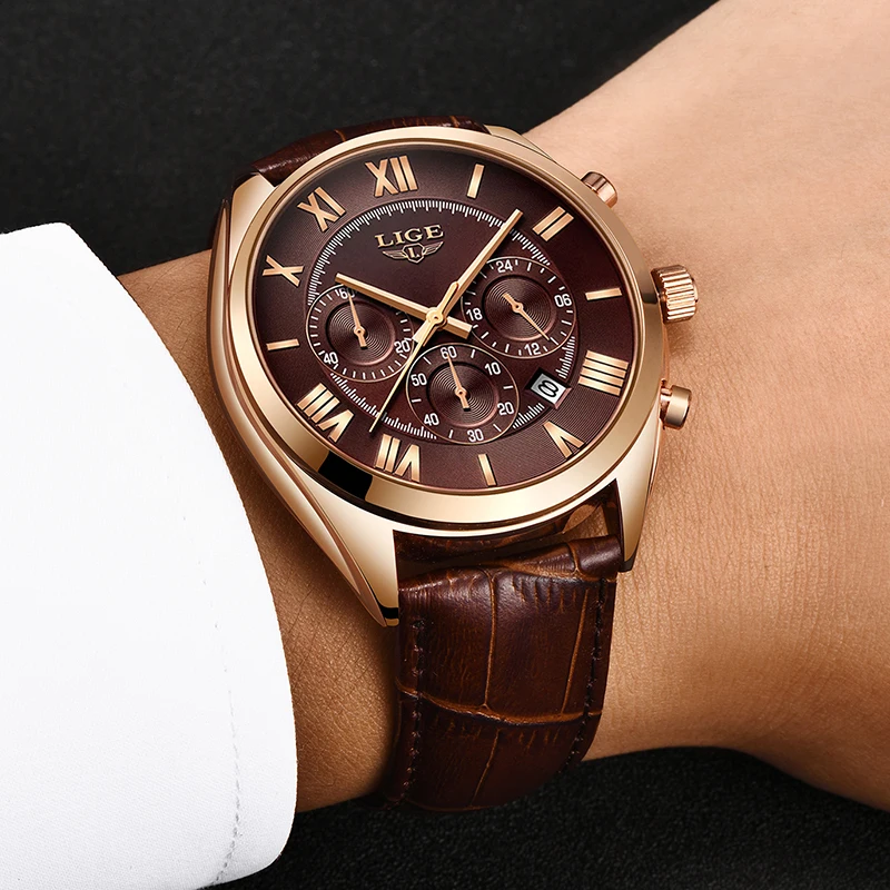 Часы наручные LIGE Мужские кварцевые, брендовые Роскошные водонепроницаемые спортивные с коричневым кожаным ремешком, с 24-часовым циферблатом, с датой