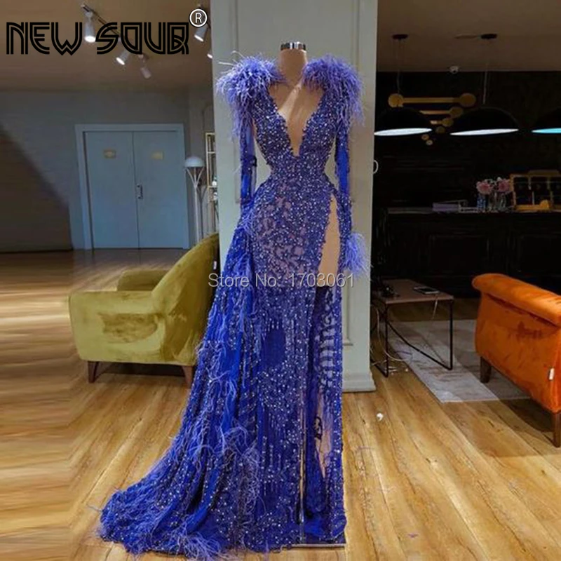 Вечернее платье с бисером и перьями, с разрезом сбоку