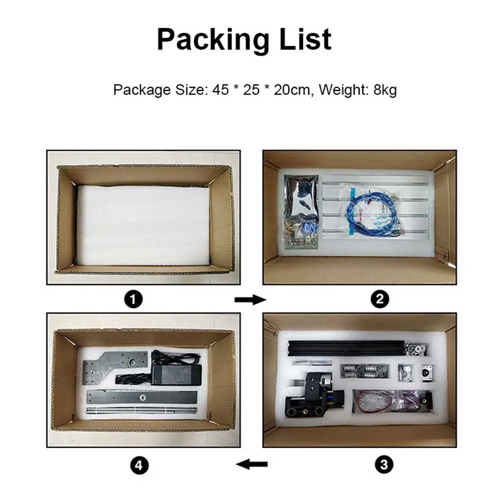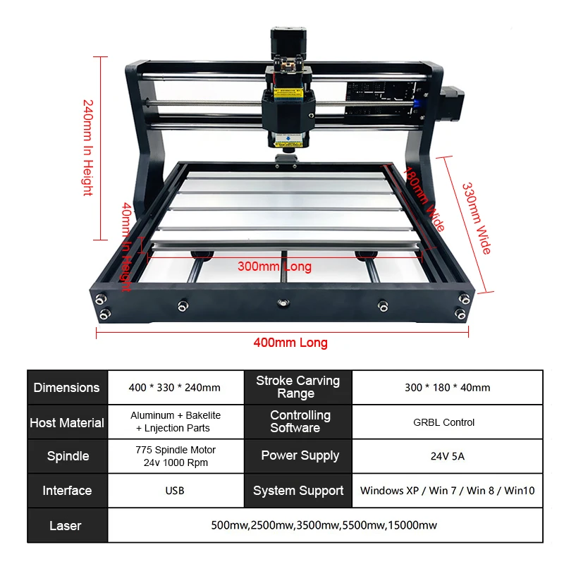 Материал оправы 3018 Pro Max: фенольная смола высокого качестваПосылка включает:Пожалуйста, внимательно выбирайте, что хотите, вам лучше связаться с нами.1. Стандарт: 3018 Pro + ER11 + 4 зажима + 10 бит2. Добавить Автономный контроллер: 3018 ProBM + ER11 + 4 зажима + 10 бит + Автономный контроллер3. Добавить лазер: 3018 ProBM + ER11 + 4 шт клипсы + 10 шт бит + Goggle + лазер (который вы выбираете)Функции и параметры:Модель: 3018ProПлощадь Гравировки: 300x180x45 мм;Площадь пластины из алюминиевого сплава: 300x180 мм;Мотор шпинделя: DC24V, макс. 120 ватт, 10000 об/мин;Шаговый двигатель: DRV8825, чем лучше A4988. Вход DC12V,1.3A, 0.3Nm крутящий момент;Питание: Вход AC100-240V В переменного тока, 50/60 Гц, 1.3A, Выход DC24V 5A;Программное обеспечение управления: GRBL контроль;Доступная система для ПК: Windows XP/7/8/10 (не поддерживает Mac OS);ER11 был установлен на шпиндельном двигателе3 оси гравировки для: дерева, пластика, PCB, акрила, фанеры и т. Д.Лазерная гравировка для: дерева, пластика, кожи, кости, камня, бумаги, оболочки и т. Д.Примечание: лазер с фиксированным фокусом 15 Вт может гравировать нержавеющую сталь и анодированный алюминий.
