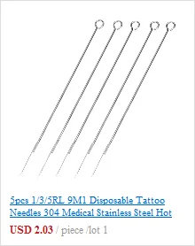 Особенности:1. Изготовлено из нержавеющей стали, тонкая работа, duable2. Отдельная блистерная упаковка, дезинфекция, безопасность и очистка3. Подходит для всех типов тату-машин Параметры:1. Модели: 1RL, 3RL, 5RL, 7RL, 9RL, 7M1, 9M1, 9RS2. Цвет: серебристый3. Материал: нержавеющая сталь 3044. Игла Длина: 14,1 см5. Игла Диаметр: 0,1 см6. Кончик иглы Длина: 2,9 см7. Вес нетто: 9 г Посылка включает в себя:5 x Одноразовые Иглы для татуировки, медицинская нержавеющая сталь, серебро